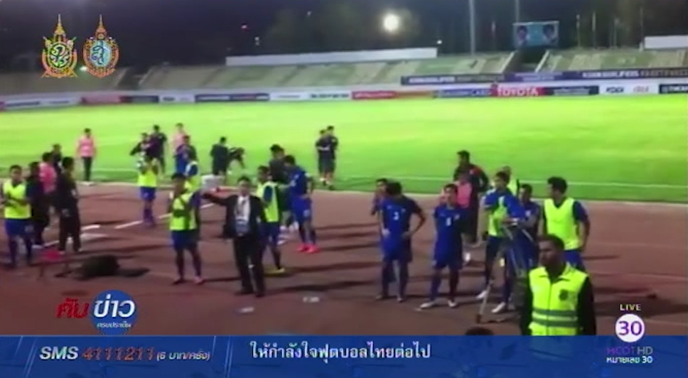 อิหร่าน 11 ต.ค.-บรรยากาศหลังเกมคัดฟุตบอลโลก 2018 โซนเอเชีย รอบ 12 ทีมสุดท้าย นัดที่ 4 ประเทศอิหร่าน ผลการแข่งขัน ทีมชาติไทย แพ้ อิรัก 0-4 นักเตะและสตาฟฟ์เดินมาขอบคุณแฟนบอลชาวไทยที่มาร่วมเชียร์ถึงขอบสนาม.-สำนักข่าวไทย