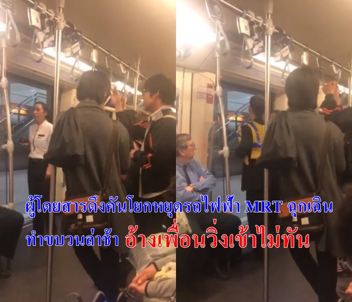 กทม. 22 ธ.ค.-แห่แชร์คลิปผู้โดยสารดึงคันโยกหยุดรถไฟฟ้า MRT ฉุกเฉิน ทำการเดินทางต้องล่าช้า อ้างเพื่อนวิ่งเข้าไม่ทัน ด้าน MRT โพสต์คลิปเผยการเข้าขบวนรถไฟไม่ทันไม่ใช่เหตุฉุกเฉิน