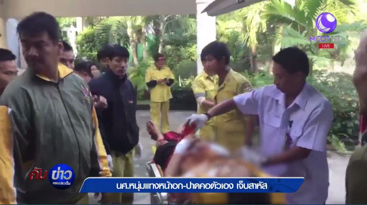 สมุทรปราการ 22 ธ.ค.-นักศึกษามหาวิทยาลัยชื่อดังในสมุทรปราการ ดื่มเหล้าขาวเกือบหมดขวด ก่อนทำร้ายตัวเองโดยใช้มีดคัตเตอร์ปาดคอ และใช้กรรไกร กับไขควงแทงตามร่างกาย อาการสาหัส