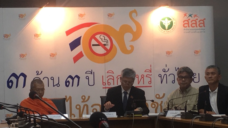 ดร.นพ.บัณฑิต ศรไพศาล รองผู้จัดการกองทุนสนับสนุนการสร้างเสริมสุขภาพ(สสส.) แถลงข่าว การจัดงาน สวดมนต์ข้ามปี อธิษฐานบารมีชวนทำดี เลิกบุหรี่ทั่วไทย มุ่งหวังให้ประชาชน ร่วมกันอธิษฐานจิต เริ่มต้นสิ่งดีๆในปีใหม่ 2561 โดยใช้คืนวันที่ 31 ธันวาคม 2560 ในเวลา 23.55-24.00 ร่วมกิจกรรมใน 100 วัด ที่ร่วมโครงการ อธิษฐานจิตเลิกบุหรี่ ตั้งแต่วันนี้ด้วยความมุ่งมั่น นอกจากเพื่อให้ตนเองมีสุขภาพดีแล้ว ยังจะเป็นไปตามแผนยุทธศาสตร์การควบคุมยาสูบแห่งชาติ ฉบับที่ 2 ที่กำหนดให้ภายใน ปี 2559 -2562 ลดอัตราการสูบบุหรี่ได้เหลือ ร้อยละ 16.7 จากปัจจุบันในปี 2558 พบมีอัตราการสูบ ร้อยละ 19.9 ตามโครงการ 3 ล้าน 3 ปี เลิกบุหรี่ทั่วไทย ทั้งนี้ยังให้อสม.อสส.ในพื้นที่ ร่วมสนับสนุนเปลี่ยนแปลงพฤติกรรมสุขภาพของประชาชนด้วย ในการสื่อสารให้ความรู้ชักชวนประชาชนลดละเลิกบุหรี่ปีใหม่ เพราะปัญหาบุหรี่ ทำให้เสียชีวิตถึงปีละ 50,000 คน