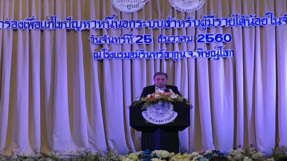 นายอภิศักดิ์ ตันติวรวงศ์ รัฐมนตรีว่าการกระทรวงการคลัง มอบนโยบาย “แนวทางแก้ปัญหาหนี้นอกระบบสำหรับผู้มีรายได้น้อย จังหวัดพิษณุโลก” ว่า การช่วยเหลือผู้ลงทะเบียนสวัสดิการแห่งรัฐเฟส 2 จะแตกต่างจากรอบแรก เตรียมส่งผู้เชี่ยวชาญหรือหมอหนี้จากหลายหน่วยงานลงพื้นที่สอบถามความต้องการให้ช่วยแก้ปัญหา ทั้งจัดหางาน ฝึกอบรมอาชีพ ติดต่อต้องการทำอาชีพอะไร จากนั้นจะนำมาฝึกอบรม ใช้หัวขบวนทางด้านเกษตรของธนาคารเพื่อการเกษตรและสหกรณ์การเกษตร (ธ.ก.ส.) เพื่อให้พ้นความยากจน ขณะที่ธนาคารออมสินพร้อมปล่อยกู้ทำแฟรนไชส์ เป็นผู้ประกอบการ ย้ำทุกคนต้องขยันทำงานไม่งั้นไม่หายจน โดยคนกลุ่มมีปัญหาหนี้ 1.2 ล้านคนต้องปลดภาระหนี้ก่อน จึงจะเริ่มกลับมาประกอบอาชีพยั่งยืนได้ เพื่อดึงรายย่อยทุกคนที่ลงทะเบียนสวัสดิการรายได้ต่ำกว่า 30,000 บาทต่อปี ประมาณ 4-5 ล้านคนมาช่วยดูแล