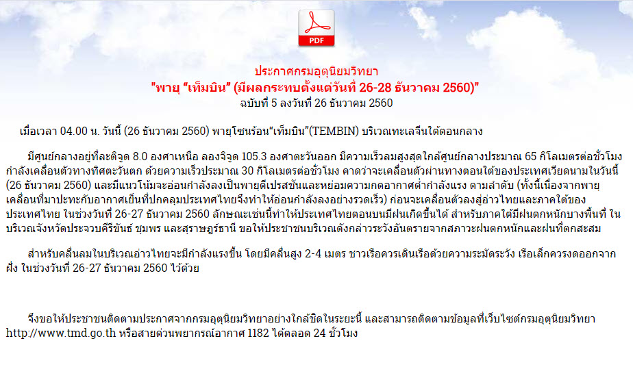 เมื่อเวลา 04.00 น. วันนี้ (26 ธันวาคม 2560) พายุโซนร้อน “เท็มบิน” (TEMBIN) บริเวณทะเลจีนใต้ตอนกลาง มีศูนย์กลางอยู่ที่ละติจูด 8.0 องศาเหนือ ลองจิจูด 105.3 องศาตะวันออก มีความเร็วลมสูงสุดใกล้ศูนย์กลางประมาณ 65 กิโลเมตรต่อชั่วโมง กำลังเคลื่อนตัวทางทิศตะวันตก ด้วยความเร็วประมาณ 30 กิโลเมตรต่อชั่วโมง คาดว่าจะเคลื่อนตัวผ่านทางตอนใต้ของประเทศเวียดนามในวันนี้ (26 ธันวาคม 2560) และมีแนวโน้มจะอ่อนกำลังลงเป็นพายุดีเปรสชั่นและหย่อมความกดอากาศต่ำกำลังแรง ตามลำดับ (ทั้งนี้เนื่องจากพายุเคลื่อนที่มาปะทะกับอากาศเย็นที่ปกคลุมประเทศไทยจึงทำให้อ่อนกำลังลงอย่างรวดเร็ว) ก่อนจะเคลื่อนตัวลงสู่อ่าวไทยและภาคใต้ของประเทศไทย ในช่วงวันที่ 26-27 ธันวาคม 2560 ลักษณะเช่นนี้ทำให้ประเทศไทยตอนบนมีฝนเกิดขึ้นได้ สำหรับภาคใต้มีฝนตกหนักบางพื้นที่ ในบริเวณจังหวัดประจวบคีรีขันธ์ ชุมพร และสุราษฎร์ธานี ขอให้ประชาชนบริเวณดังกล่าวระวังอันตรายจากสภาวะฝนตกหนักและฝนที่ตกสะสม