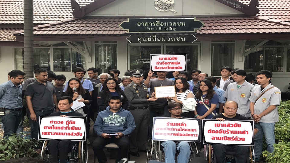 นางรัชฐิรัชฎ์ ซุ่นสั้น ภรรยาดาบตำรวจอนันต์ ซุ่มสั้น ผบ.หมู่งานสืบสวน สภ.คลองเต็ง จ.ตรัง เหยื่อเมาแล้วขับ ที่ถูกคนเมาชนเสียชีวิต 5 ศพ เมื่อวันที่ 7 พค. ที่ผ่านมา และนายพิชัย ทองรุ่ง นักศึกษามหาวิทยาลัยรามคำแหง อาสาสมัครกู้ภัยที่ต้องพิการจากคนเมาแล้วขับพร้อมด้วยเครือข่ายองค์กรงดเหล้า และเครือข่ายเหยื่อเมาแล้วขับ และภาคีเครือข่ายที่เกี่ยวข้องกว่า 30 คน เข้ายื่นหนังสือถึง พล.ต.อ.จักรทิพย์ ชัยจินดา ผู้บัญชาการตำรวจแห่งชาติ เพื่อเรียกร้องให้เพิ่มโทษกฎหมายเมาแล้วขับให้สูงขึ้น พร้อมสาวให้ถึงต้นตอร้านค้า สถานบันเทิงที่ขายเหล้าเบียร์ให้กับผู้ที่เมาแล้วขับ โดยเฉพาะในช่วงเทศกาลปีใหม่ที่กำลังจะมาถึงนี้ โดยมี พลตำรวจตรีมนตรี ยิ้มแย้ม รองโฆษกสำนักงานตำรวจแห่งชาติ เป็นตัวแทนมอบหนังสือร้องเรียน