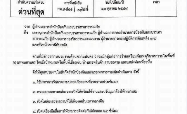 ขณะเดียวกัน รายงานข่าวแจ้งว่าในวันนี้ ผู้อำนวยการสำนักป้องกันและบรรเทาสาธารณภัย กรุงเทพมหานคร(กทม.) ได้ทำหนังสือด่วนที่สุด เลขที่ 1801/1788 ลงวันที่ 11 ต.ค.2559 ถึง เลขานุการสำนักป้องกันและบรรเทาสาธารณภัย ผู้อำนวยการกองอำนวยการป้องกันและบรรเทาสาธารณภัย ผู้อำนวยการกองวิชาการและแผนงาน ผู้อำนวยการกองปฏิบัติการดับเพลิง1-4 และหัวหน้าสถานีดับเพลิง โดยหนังสือระบุว่าตามที่มีข่าวจากหน่วยความมั่นคงว่า จะมีกลุ่มก่อการร้ายเตรียมก่อเหตุวินาศกรรมในพื้นที่กรุงเทพมหานคร โดยมีเป้าหมายหรือพื้นที่เสี่ยง เช่น ห้างสรรพสินค้า ลานจอดรถ และแหล่งท่องเที่ยวนั้น จึงให้ทุกหน่วยงานในสังกัดสำนักป้องกันและบรรเทาสาธารณภัย ดำเนินการ