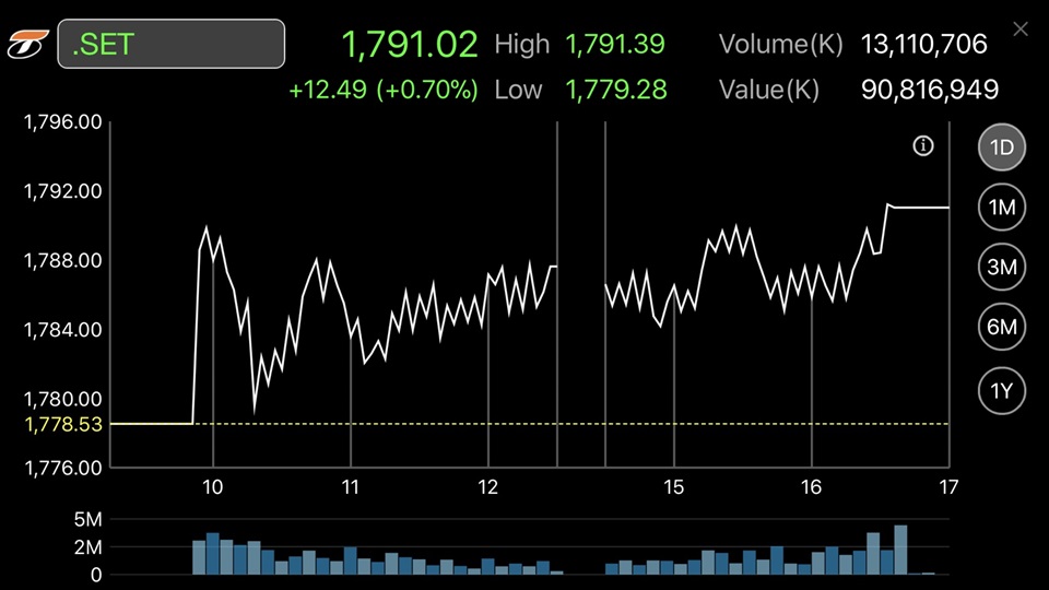 โดยดัชนีฯแตะจุดสูงสุดที่ 1,791.39 จุด และแตะจุดต่ำสุดที่ระดับ 1,779.28 จุด