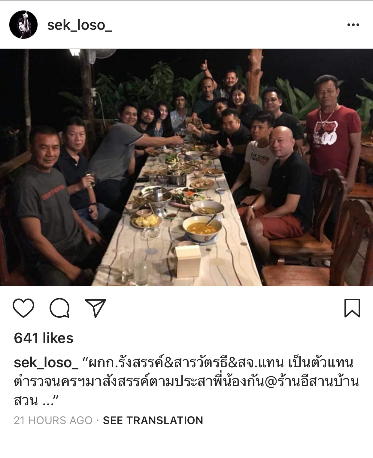 พ.ต.อ.กฤษณะ พัฒนเจริญ รองโฆษก ตร. เปิดเผยถึงกรณีที่ “เสก โลโซ” โพสต์ภาพและข้อความผ่านสื่อออนไลน์โดยมีข้อความว่า “ผกก.รังสรรค์&สารวัตรธี&สจ.แทน เป็นตัวแทนตำรวจนครฯมาสังสรรค์ตามประสาพี่น้องกัน@ร้านอีสานบ้านสวน” ซึ่งมีผู้เข้าชมและวิจารณ์ถึงความเหมาะสมจำนวนมากนั้น ได้รับรายงานจาก กองบังคับการตำรวจภูธรจังหวัดนครศรีธรรมราช ว่าได้ตั้งกรรมการตรวจสอบข้อเท็จจริงในเรื่องดังกล่าวแล้ว ทราบชื่อผู้ที่ปรากฏในรูปคือ พ.ต.อ.รังสรรค์ สุขเกื้อ ผกก.สส.ภ.จว.นครศรีธรรมราช และ พ.ต.ท.ธีระพล พุ่มชัย สวป.สภ.เมืองนครศรีธรรมราช โดยในเรื่องนี้จะต้องมีการตรวจสอบถึงพฤติกรรมที่ปรากฏว่ามีเหมาะสมหรือไม่ และให้โอกาสกับผู้ที่เกี่ยวข้องพิสูจน์ข้อเท็จจริงเพื่อให้ความเป็นธรรมกับทุกฝ่าย