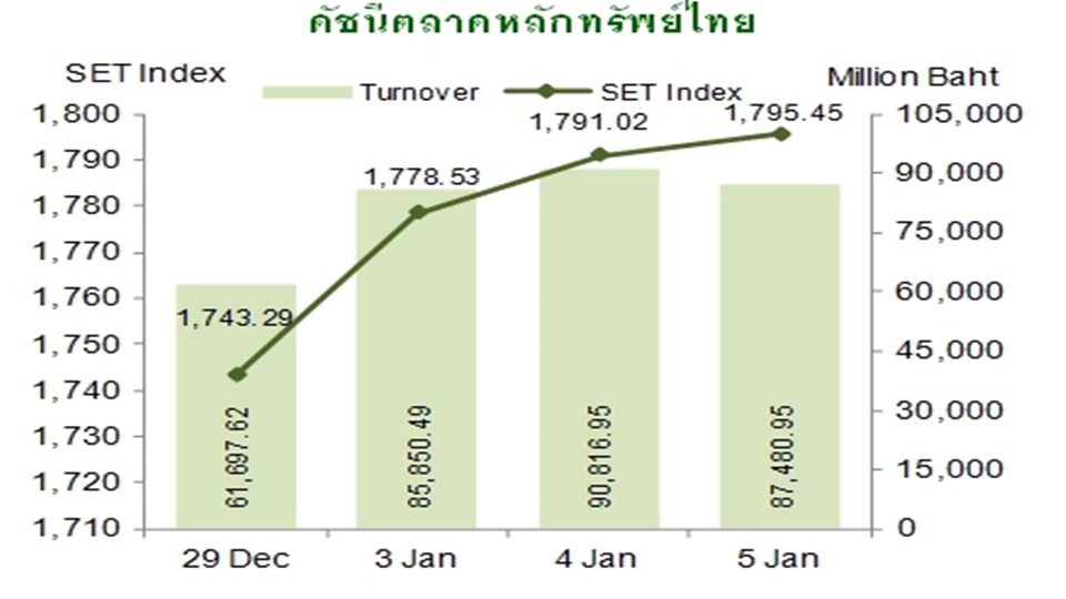 บริษัทหลักทรัพย์กสิกรไทย จำกัด รายงานว่าสัปดาห์ที่ผ่านมา (3-5 ม.ค.) ดัชนีตลาดหุ้นไทยแตะระดับสูงสุดเป็นประวัติการณ์ที่ 1,803.93 จุด ก่อนจะปิดปลายสัปดาห์ที่ระดับ 1,795.45 เพิ่มขึ้นร้อยละ 2.38 จากสัปดาห์ก่อน มูลค่าการซื้อขายเฉลี่ยต่อวันเพิ่มขึ้นประมาณร้อยละ 74.52 จากสัปดาห์ก่อนมาที่ 88,049.46 ล้านบาท ส่วนตลาดหลักทรัพย์ mai ปิดที่ 537.46 จุด ลดลงร้อยละ 0.54 จากสัปดาห์ก่อน