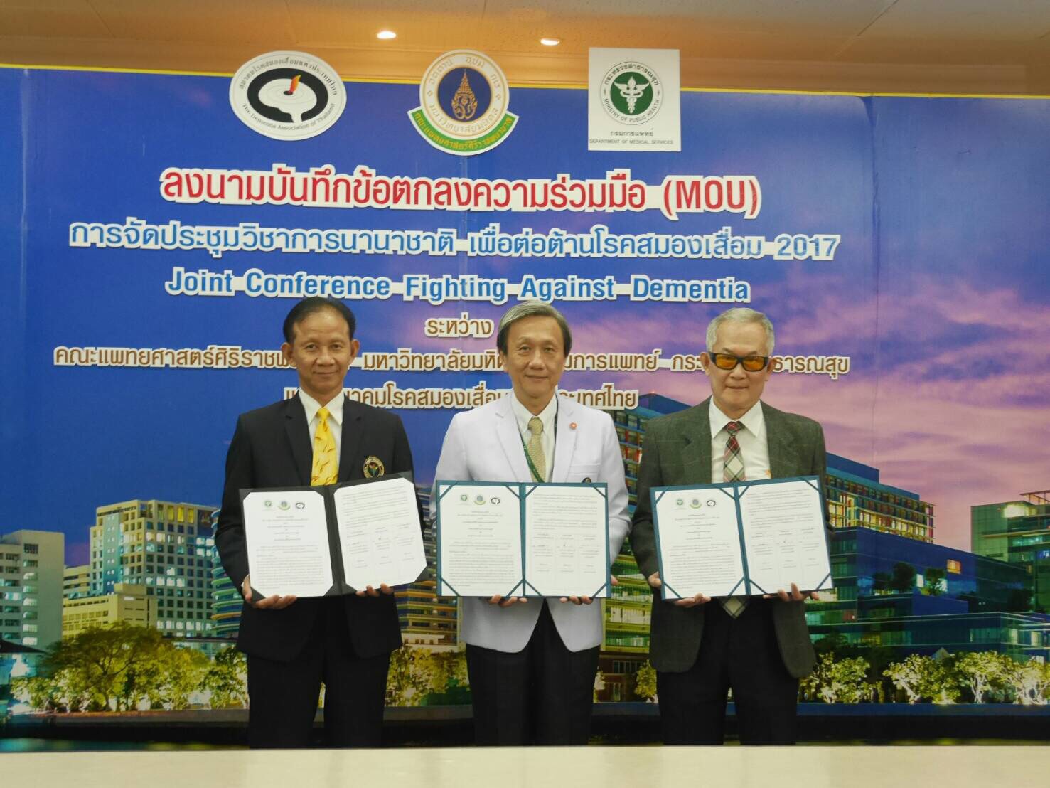 นพ.ประสิทธิ วัฒนาภา คณบดีคณะแพทยศาสตร์ศิริราชพยาบาล พร้อมด้วย นพ.ธีรพล โตพันธานนท์ อธิบดีกรมการแพทย์ และ นพ.ประเสริฐ บุญเกิด นายกสมาคมโรคสมองเสื่อมแห่งประเทศไทย ลงนามความร่วมมือต่อต้านและดูแลผู้ป่วยสมองเสื่อม พร้อมเตรียมพร้อมเป็นเจ้าภาพจัดการประชุมโรคสมองเสื่อมในปี 2017 โดยย้ำว่า โรคสมองเสื่อม มักเกิดและพบมากขึ้นในสังคมผู้สูงอายุ ยิ่งมีประชากรสูงอายุเท่าไหร่ โรคสมองเสื่อมยิ่งพบมากขึ้น ความชุกโรคจากสถิติปี 2558 พบว่า ในประชากรมีผู้ป่วยโรคสมองเสื่อมถึงร้อยละ 3-5 พบมาให้ผู้สูงอายุ 85 ปีขึ้นไป ถึงร้อยละ 30 จึงคาดการณ์ว่าขณะนี้ประเทศไทยมีผู้ป่วยโรคสมองเสื่อมมากถึง 600,000 คน และคาดว่าในปี 2573 จะมีผู้ป่วยโรคสมองมากขึ้นอีกร้อยละ 20 หรือมีประชากรป่วยมากถึง1,100,000 คน