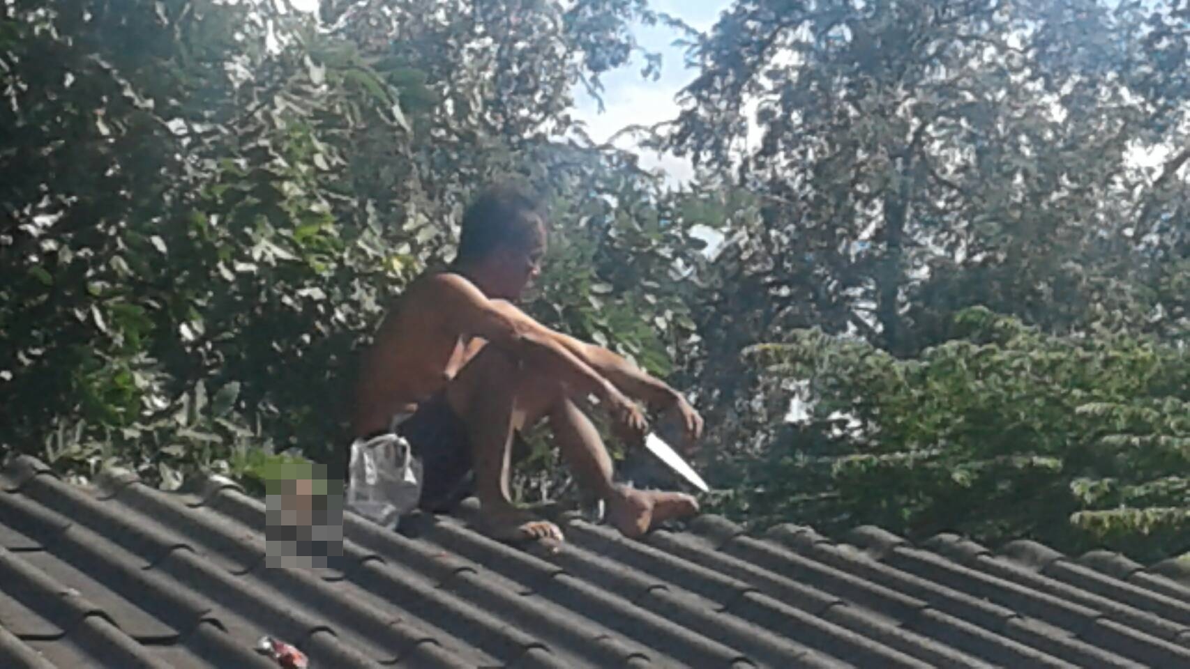 นายตูน ยังคงถือมีดอยู่ในมือและนั่งอยู่บนหลังคาบ้าน ห้ามไม่ให้ผู้ใดเข้าใกล้ ต้องการพบภรรยาที่หนีออกจากบ้านไปหลายวัน เพราะทนถูกทุบตีไม่ไหว