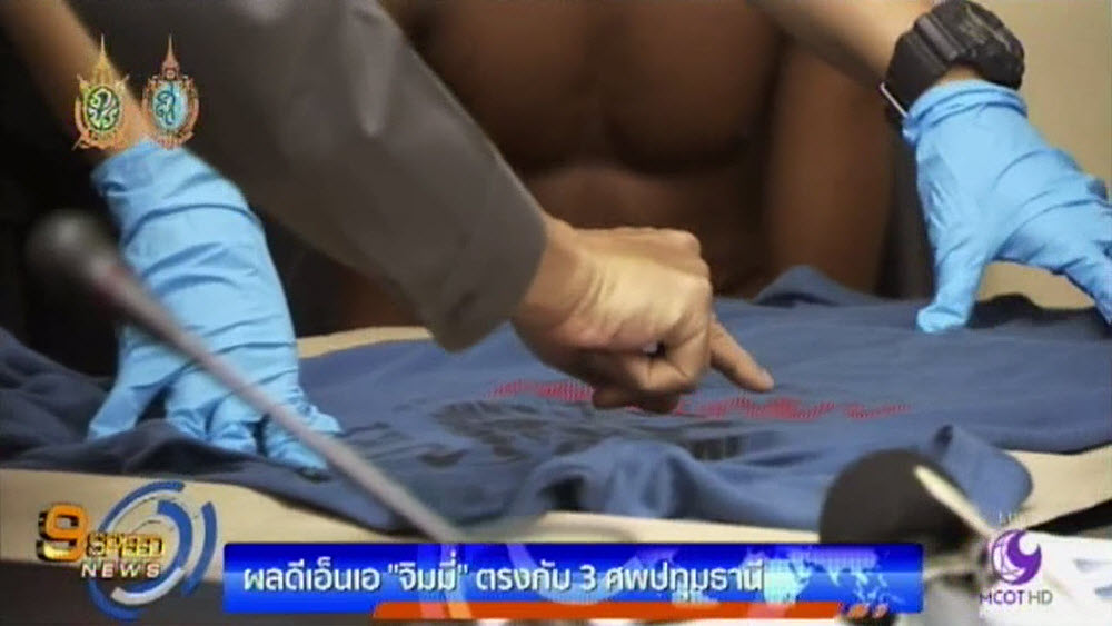 กรุงเทพฯ 10 ต.ค.-ผบช.น.เผยผลตรวจดีเอ็นเอจากคราบเลือดบนเสื้อนายจิมมี่ ผู้ต้องหาคดีฆ่า 3 ศพที่ปทุมธานี กับตรงกับเหยื่อรายแรก และรายที่ 3 ส่วนรายที่ 2 ผลยังไม่ออก