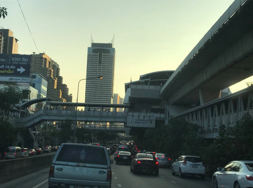 ถนนสุขุมวิท ขาเข้า ช่วงใต้บีทีเอสพระโขนง ปริมาณรถเริ่มมาก เคลื่อนตัวได้ช้า