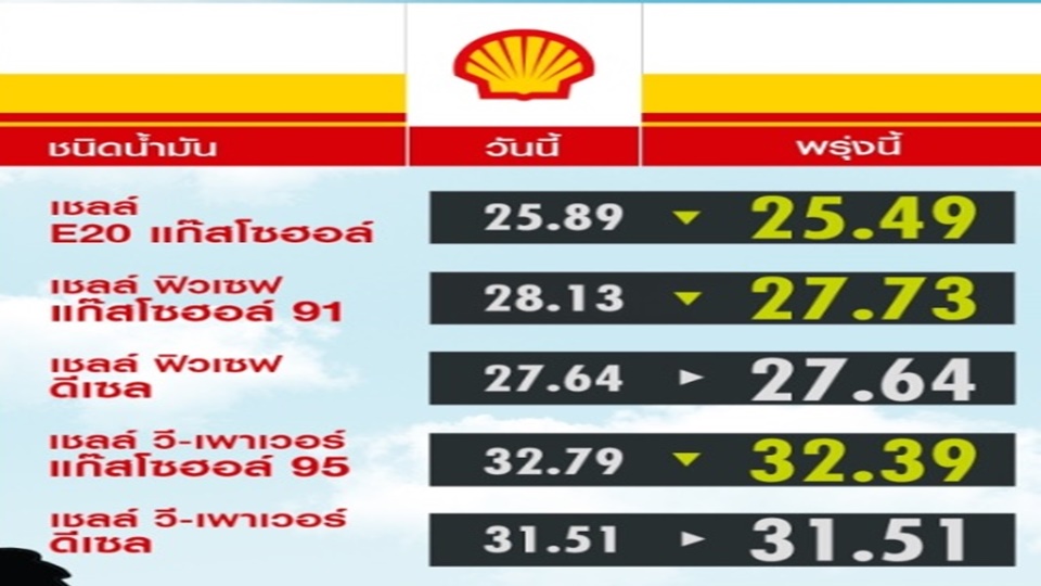 บริษัท เชลล์ ประกาศปรับลดราคาน้ำมันกลุ่มแก๊สโซฮอล์ลงลิตรละ 40 สตางค์ ส่วนดีเซลคงเดิม มีผลพรุ่งนี้ (10 ม.ค.) ซึ่งเป็นการลดลงให้เหลือเท่ากับ บมจ.ปตท.และบางจากฯ ราคาในเขตกรุงเทพฯ และปริมณฑล ดังนี้ แก๊สโซฮอล์ 91 อยู่ที่ 27.73 บาท แก๊สโซฮอล์ 95 อยู่ที่ 32.39 บาท E 20 อยู่ที่ 25.49 บาท และดีเซล 27.64 บาทต่อลิตร .-สำนักข่าวไทย