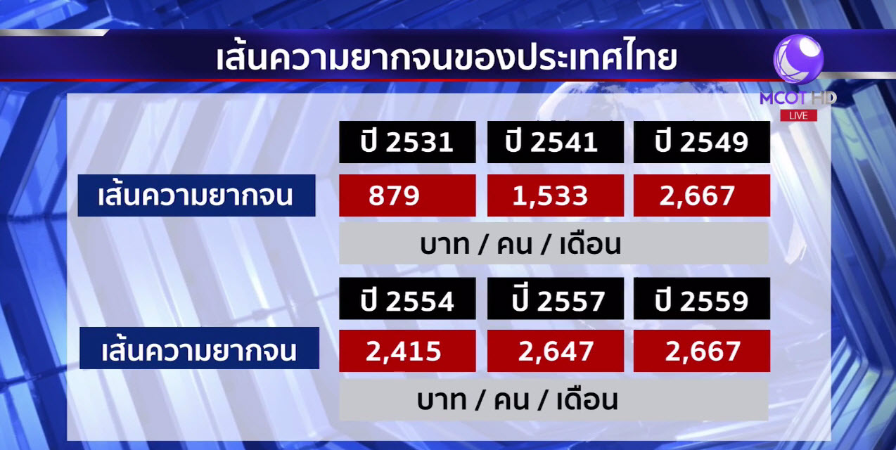 ข้อมูลจากรายงานการวิเคราะห์สถานการณ์ความยากจนและความเหลื่อมล้ำในประเทศไทย ประจำปี 2559 ของสำนักงานคณะกรรมการพัฒนาการเศรษฐกิจและสังคมแห่งชาติ (สศช.) ระบุว่า ในปี 2531 ไทยมีเส้นความยากจนที่ 879 บาทต่อคนต่อเดือน ถัดมาในปี 2541 ขยับขึ้นมาที่ 1,533 บาทต่อคนต่อเดือน จากนั้นในปี 2549 ขยับขึ้นมาอยู่ที่ 2,667 ต่อคนต่อเดือน ต่อเนื่องในปี 2554 และ ปี 2557 ขยับมาที่ 2,415 บาท และ 2,647 บาทต่อคนต่อเดือน และล่าสุดในปี 2559 เส้นความยากจนอยู่ที่ 2,667 บาทต่อคนต่อเดือน