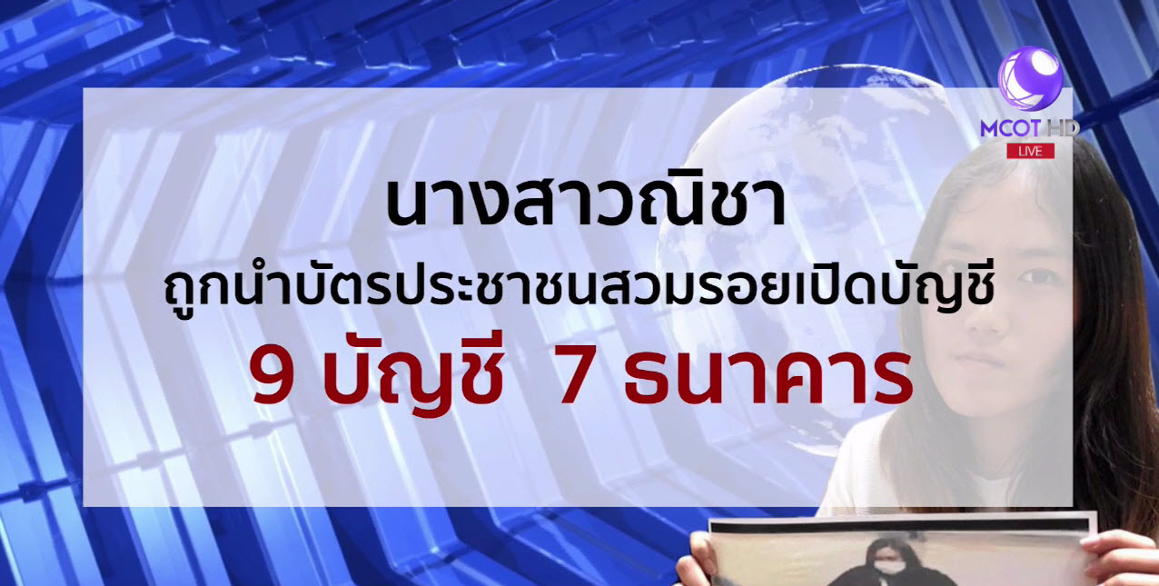 และเมื่อวานนี้ (9 ม.ค.) น.ส.ณิชา พร้อมด้วยพี่สาว ได้เดินทางไปยังกองบังคับการปราบปรามเพื่อร้องขอความเป็นธรรม และเร่งรัดดำเนินคดีกับผู้ที่นำบัตรประชาชนไปเปิดบัญชีธนาคาร สรุปแล้ว น.ส.ณิชา ถูกนำบัตรประชาชนไปสวมรอยเปิดบัญชีรวมทั้งสิ้น 9 บัญชี จากธนาคารชั้นนำทั้งหมด 7 แห่ง ทั้งพื้นที่บางแค ลาดพร้าว สีลม และงามวงศ์วาน. – สำนักข่าวไทย