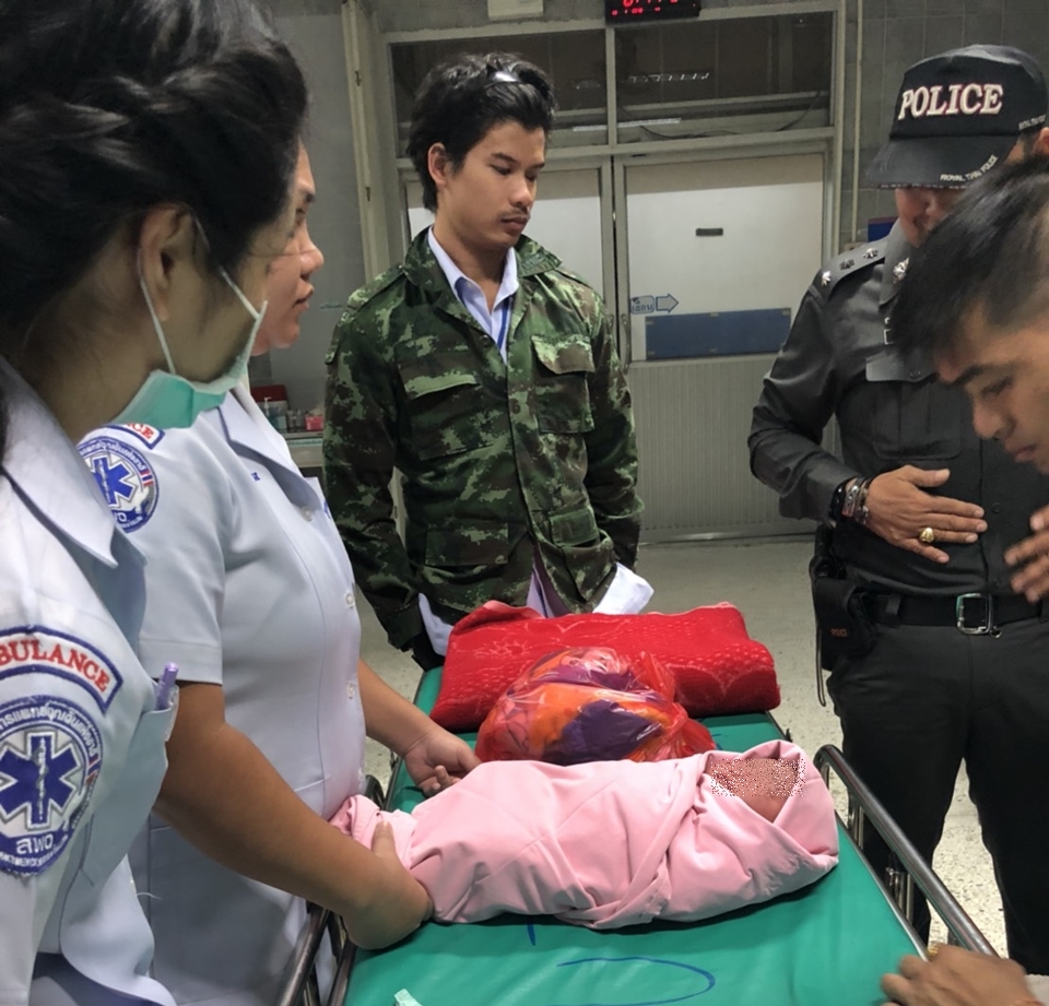 จึงนำกำลังไปตรวจสอบที่เกิดเหตุ พบทารกอายุประมาณ 7 วัน เพศหญิง ถูกห่อตัวด้วยผ้าสีน้ำเงินลายการ์ตูน นอนหนาวสั่นเนื่องจากสภาพอากาศหนาวเย็น และถูกยุงและมดกัดตามร่างกาย เจ้าหน้าที่จึงรีบนำตัวส่งโรงพยาบาลบางปะกงทันที ตรวจสอบเบื้องต้นพบว่าเด็กสุขภาพแข็งแรง แต่ผิวแห้งเนื่องจากอากาศหนาว น้ำหนักตัว 3,400 กรัม สายสะดือตัดแล้ว