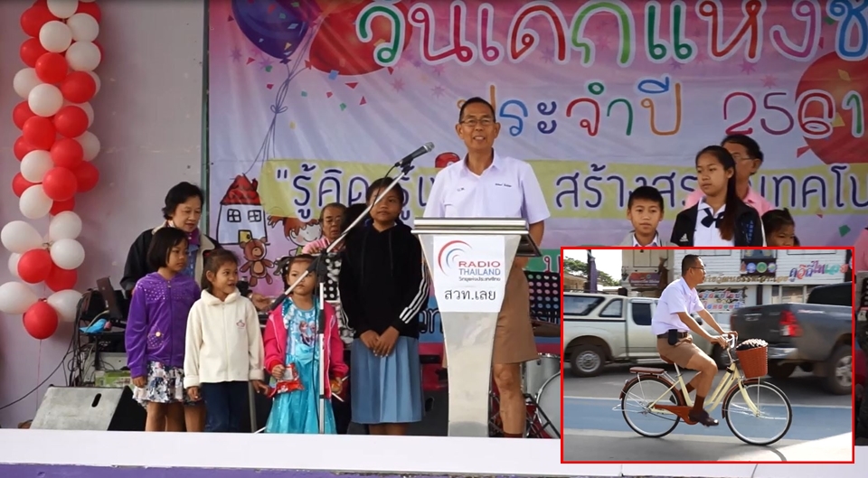 หลังแต่งชุดนักเรียนเข้ากับบรรยากาศวันเด็กเสร็จแล้ว ผู้ว่าฯเลย ก็ปั่นรถจักรยานคู่กาย ออกจากจวนผู้ว่าฯ ตั้งแต่เวลา 08.00 น.เพื่อไปเป็นประธานเปิดงานวันเด็กฯ ของหน่วยงานต่างๆ โดยไม่มีเลขานุการหรือผู้ติดตามแม้แต่คนเดียว รวมทั้งไม่มีรถตำรวจนำทางด้วย โดยงานแรกอยู่ที่ลานหน้า สวท. สวนสุขภาพกุดป่อง โรงเรียนเลยพิทยาคม หน้าศาลากลางจังหวัดเลย