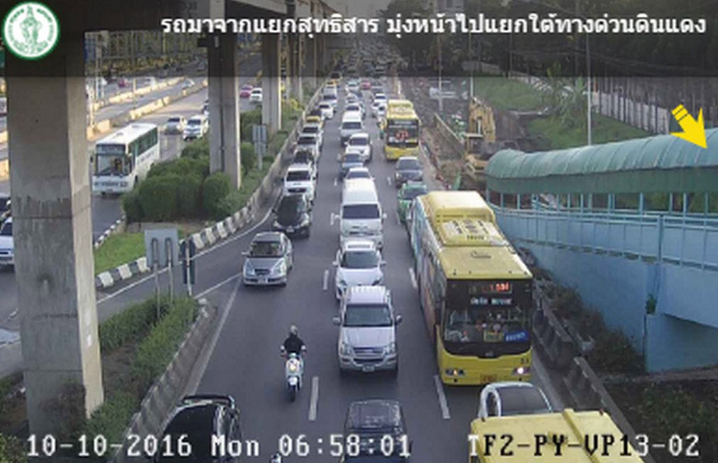 สภาพการจราจร ถนนวิภาวดีรังสิต ขาเข้า จากแยกสุทธิสาร มุ่งหน้าแยกใต้ด่วนดินแดง รถมากชะลอตัวช้า ท้ายสะสมหน้ามหาวิทยาลัยหอการค้าไทย