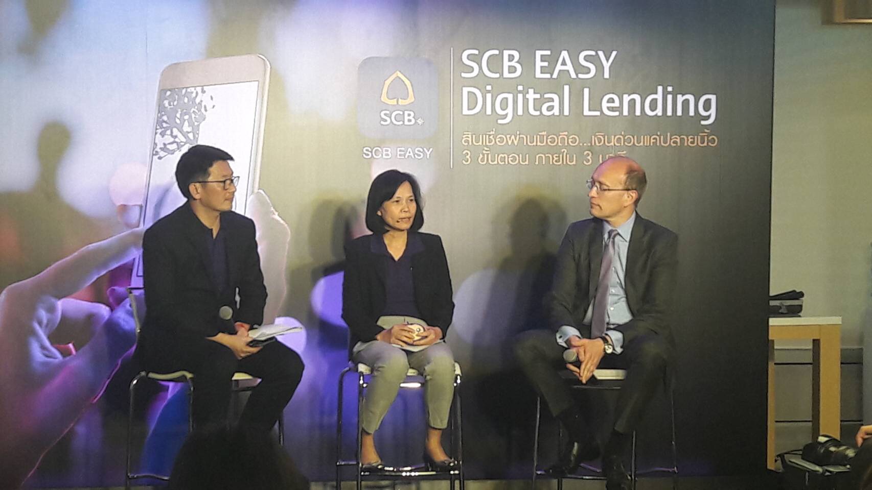 นางอภิพันธ์ เจริญอนุสรณ์ รองผู้จัดการใหญ่อาวุโส ธนาคารไทยพาณิชย์ กล่าวว่า ธนาคารได้ให้บริการสินเชื่อรูปแบบใหม่คือสินเชื่อผ่านมือถือ …เงินด่วน แค่ปลายนิ้ว (SCB Easy Digital Lending ) เป็นครั้งแรกในประเทศไทย ด้วยงบประมาณ 50 ล้านบาท โดยลูกค้าไม่ต้องมายื่นเอกสารหรือกรอกข้อมูลที่สาขาธนาคารอีกต่อไป ซึ่งตรงกับพฤติกรรมของลูกค้าที่ไม่นิยมมาสาขาธนาคาร เพียงแค่ใช้บริการผ่านทางโมบายแบงก์กิ้ง SCB EASY ดำเนินการเพียง 3 ขั้นตอน ลูกค้าจะได้รับอนุมัติสินเชื่อและโอนเงินเข้าบัญชีลูกค้าทันทีภายใน 3 นาที 3 ขั้นตอน ในกรณีลูกค้าเดิม หากเป็นลูกค้าใหม่ ธนาคารต้องการเอกสารเพิ่มเติมจะติดต่อลูกค้าภายใน 1 ชั่วโมงโดยธนาคารพร้อมให้บริการตลอด 24 ชั่วโมง ผ่านช่องทางโมบายแบงก์กิ้ง