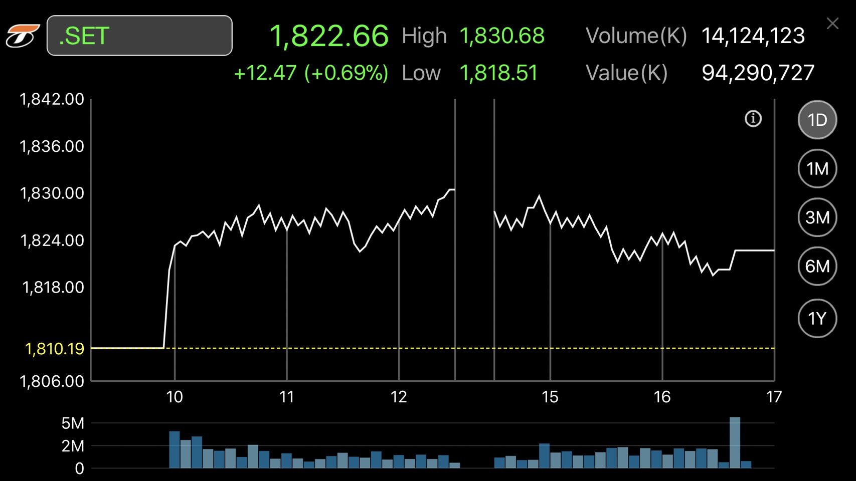 1,822.66 จุด เพิ่มขึ้น 12.47 จุด หรือร้อยละ 0.69 มูลค่าการซื้อขาย 94,290.73