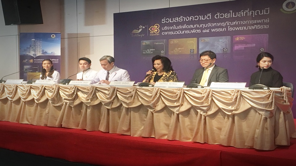 นพ.ประสิทธิ์ วัฒนาภา คณบดีแพทยศาสตร์ศิริราชพยาบาลมพร้อมด้วยนางอุษณีย์ แสงสิงแก้ว รักษาการกรรมการผู้อำนวยการใหญ่ บริษัท การบินไทย จำกัด (มหาชน) แถลงข่าวเชิญชวนสมาชิกรอยัล ออร์คิดพลัส ร่วมสร้างความดีด้วยการบริจาคไมล์สะสม ในโครงการบริจาคไมล์ “ไมล์ปันสุข” เพื่อนำไมล์สะสมที่ได้ 300 ไมล์มาแปลงเป็นตั๋วโดยสารเครื่องบิน และจากนั้นเชิญชวนผู้มีจิตศรัทธา รับตั๋วโดยสารเดินทางและยังสามารถนำใบเสร็จรับเงินลดหย่อนภาษีโดยรายได้จากการจัดกิจกรรมจะนำมา จัดหาครุภัณฑ์ทางการแพทย์ อาคารนวมินทรบพิตร 84 พรรษา โรงพยาบาลศิริราช