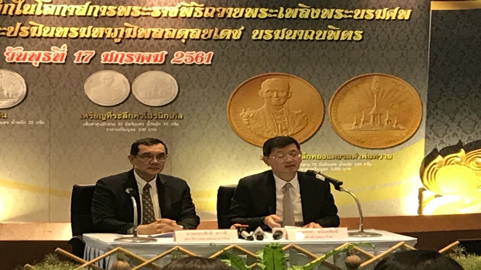 นายพชร อนันตศิลป์ อธิบดีกรมธนารักษ์ เปิดเผยว่า หลังจากได้เปิดจองเหรียญที่ระลึกในโอกาสการพระราชพิธีถวายพระเพลิงพระบรมศพพระบาทสมเด็จพระปรมินทรมหาภูมิพลอดุลยเดชบรมนาถบพิตร ทั้งหมด 4 ประเภท ได้แก่ เหรียญที่ระลึกทองคำราคาเหรียญละ50,000 บาท มียอดจอง 1.4 แสนเหรียญ , เหรียญที่ระลึกเงินราคาเหรียญละ 2,000 บาท ยอดจอง 7 แสนเหรียญ , เหรียญที่ระลึกทองแดงรมดำพ่นทรายราคาเหรียญละ 3,000 บาท มียอดจอง 79,999 เหรียญ, และเหรียญที่ระลึกคิวโปรนิกเกิลราคาเหรียญละ 100 บาท ยอดจอง 10 ล้านเหรียญ จองที่หน่วยงานของกรมธนารักษ์ทั่วประเทศและธนาคาร 19 แห่ง โดยพร้อมเปิดให้ ผู้สั่งจองมารับเหรียญได้ตั้งแต่วันที่ 29 มกราคม 61 – 31 กรกฎาคม 61 เป็นระยะเวลา 6 เดือน ย้ำว่าใครจองที่ไหนให้ไปรับที่จองเดิม