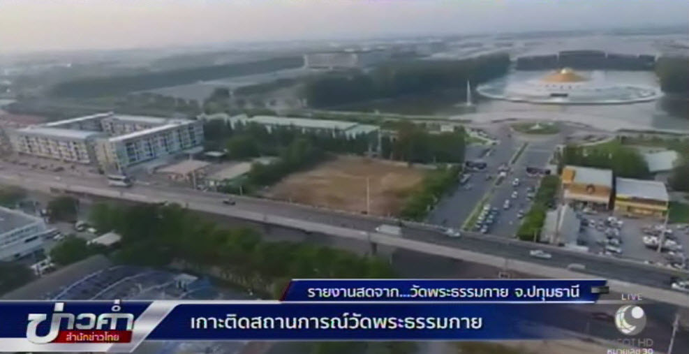 ความเคลื่อนไหวหลังจากเข้าสูวันที่ 3 ตามหมายค้นวัดพระธรรมกาย ในช่วงบ่ายวันนี้ บริเวณประตู 8 ถนนเลียบคลองแอนสอง เจ้าหน้าที่ดีเอสไอได้นำโดรนขึ้นบินสำรวจพื้นที่โดยรอบวัดพระธรรมกาย ทั้งในส่วนของพื้นที่ 2,000 ไร่ และบริเวณส่วนพื้นที่ 191 ไร่ ส่วนของเมืองแก้วมณีประตู 5 บริเวณหอฉันคุณยาย อาคาร 100 ปี จุดนี้จะเป็นกุฏิดาวดึงส์ที่ก่อนหน้ามีภาพปรากฏว่าพระธัมชโยนอนรักษาอาการอาพาธอยู่ คาดว่ามีการส่งสัญญาณภาพสดจากโดรนรายงานเข้าไปยังห้องประชุมภายใน สภ.คลองหลวง เพื่อประเมินสถานการณ์รอบด้านก่อนปฏิบัติการ โดยใช้เวลาบินสำรวจเกือบ 2 ชั่วโมง คาดว่าน่าจะเชื่อมโยงกับกระแสข่าวว่าทางดีเอสไอจะเข้าตรวจค้นและตัดน้ำตัดไฟภายในวัดพระธรรมกายวันนี้