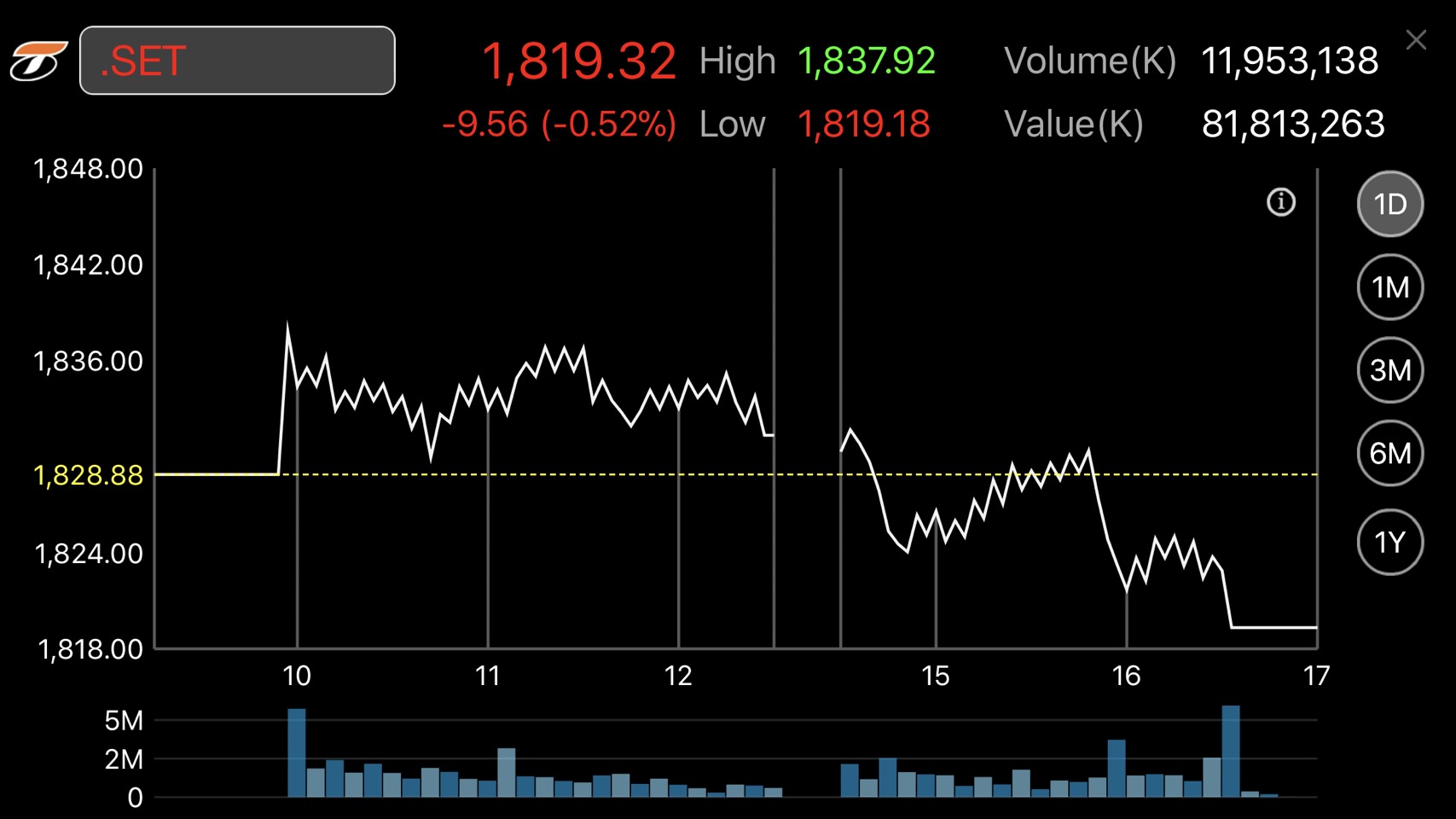ผู้สื่อข่าวรายงานว่าดัชนีตลาดหลักทรัพย์ฯ ปิดที่ระดับ 1,819.32 จุด ลดลง 9.56 จุด หรือร้อยละ 0.52 มูลค่าการซื้อขาย 81,813.26 ล้านบาท การซื้อขายหุ้นวันนี้ (18 ม.ค.) ดัชนีหุ้นไทยเคลื่อนไหวทั้งแดนบวก-ลบ โดยดัชนีฯ แตะจุดสูงสุดที่ 1,837.92 จุด และต่ำสุดที่ระดับ 1,819.18 จุด