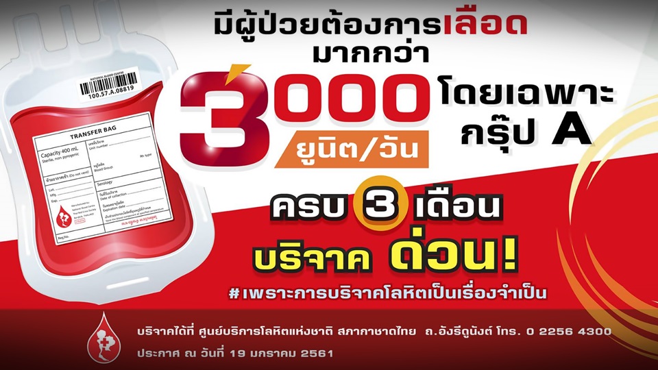 ศูนย์บริการโลหิตแห่งชาติ สภากาชาดไทย ขอรับบริจาคโลหิตให้ผู้ป่วยในโรงพยาบาลต่างๆกว่า 150 แห่ง ต้องการโลหิตทุกกรุ๊ปมากกว่า 3,000 ยูนิต/ วัน โดยเฉพาะกรุ๊ป A ทั้งนี้ ผู้ที่บริจาคโลหิตในช่วงเดือนตุลาคม 2560 หากครบ 3 เดือนแล้ว สามารถกลับมาบริจาคเพื่อช่วยเหลือผู้ป่วยให้มีโลหิตในการรักษาพยาบาล ได้ที่ ศูนย์บริการโลหิตแห่งชาติ ถนนอังรีดูนังต์ วันจันทร์ และศุกร์ เวลา 08.00-16.30 น. , วันอังคาร พุธ และพฤหัสบดี เวลา 07.30-19.30 น., วันเสาร์-อาทิตย์ และวันหยุดนักขัตฤกษ์ เวลา 08.30-15.30 น. และหน่วยเคลื่อนที่รับบริจาคโลหิตในกรุงเทพฯและปริมณฑล