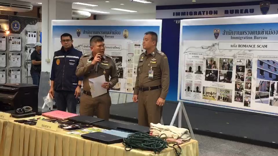 กรุงเทพฯ 19 ม.ค.- สำนักงานตรวจคนเข้าเมือง จับผู้ต้องหาแก๊งโรแมนสแกม ชาวไนจีเรีย หลอกหญิงไทยผ่านเฟสบุ๊ค และชาวปากีสถานที่รับผลิตหนังสือเดินทางปลอมรายใหญ่ที่พบว่ามีลูกค้าสั่งผลิตจากทั่วโลก