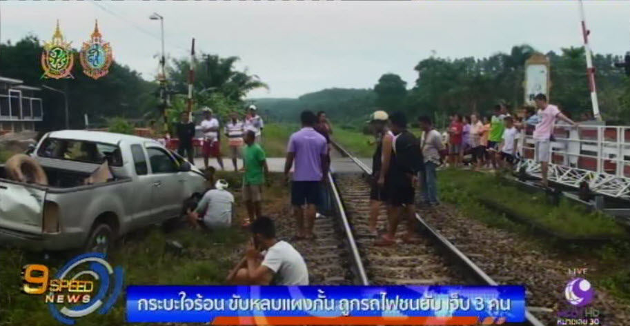 นครศรีธรรมราช 9 ต.ค. – สภาพรถกระบะโตโยต้า สีบรอนซ์เงิน ทะเบียน บท 7603 ตรัง หลังประสบอุบัติเหตุชนกับรถไฟขบวนที่ 167 กรุงเทพฯ-สุไหงโก-ลก บนถนนตัดผ่านทางรถไฟ เขตเทศบาลตำบลนาบอน จ.นครศรีธรรมราช สอบสวนทราบว่า รถคันดังกล่าวมีนายสุทิน บัวทิพย์ อายุ 65 ปี เป็นคนขับ โดยพาภรรยาและหลานชายวัย 14 ปี มาจาก จ.ตรัง เพื่อไป อ.พิปูน เมื่อมาถึงจุดเกิดเหตุ เป็นจังหวะที่รถไฟกำลังจะเข้าชานชาลาสถานีรถไฟนาบอน แต่นายสุทินไม่ยอมจอดรอ และได้ขับซิกแซกหลบแผงกั้น จนถูกขบวนรถไฟพุ่งชน เคราะห์ดีที่ทั้ง 3 คน รอดชีวิต ถูกนำตัวส่งโรงพยาบาลแล้ว. -สำนักข่าวไทย