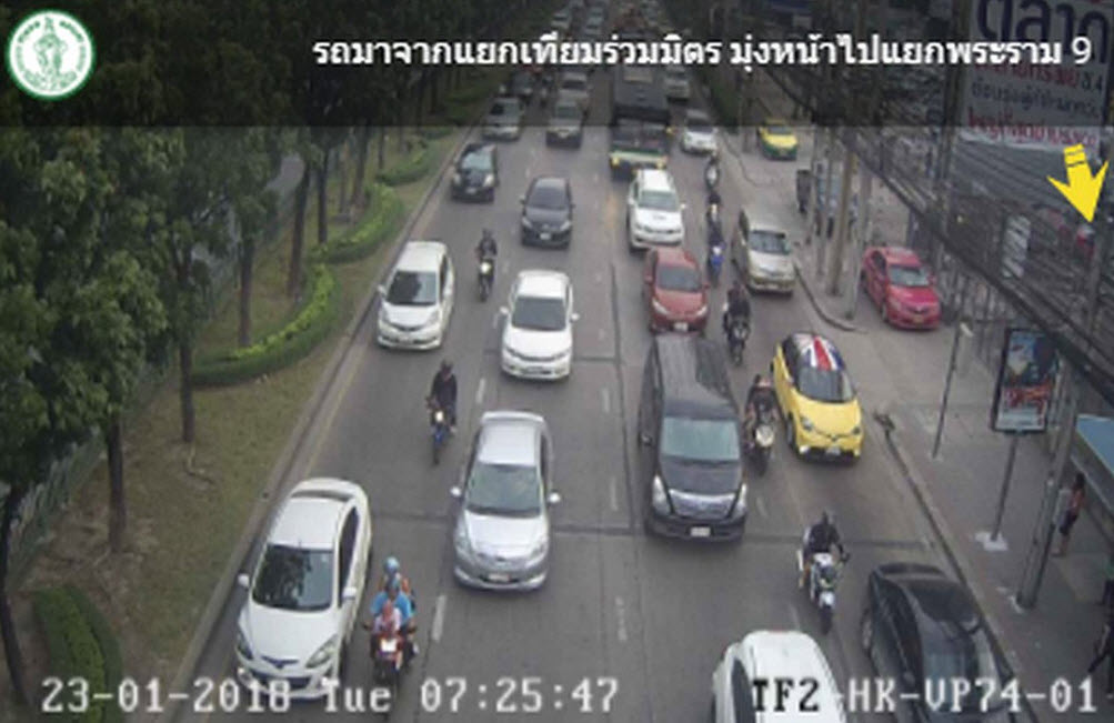 ถนนรัชดาภิเษก ขาเข้า มุ่งหน้ามาทางแยกพระราม 9 ต่อเนื่องเข้ากลางซอยอโศก รถเคลื่อนตัวช้า ท้ายสะสมที่แยกเทียมร่วมมิตร