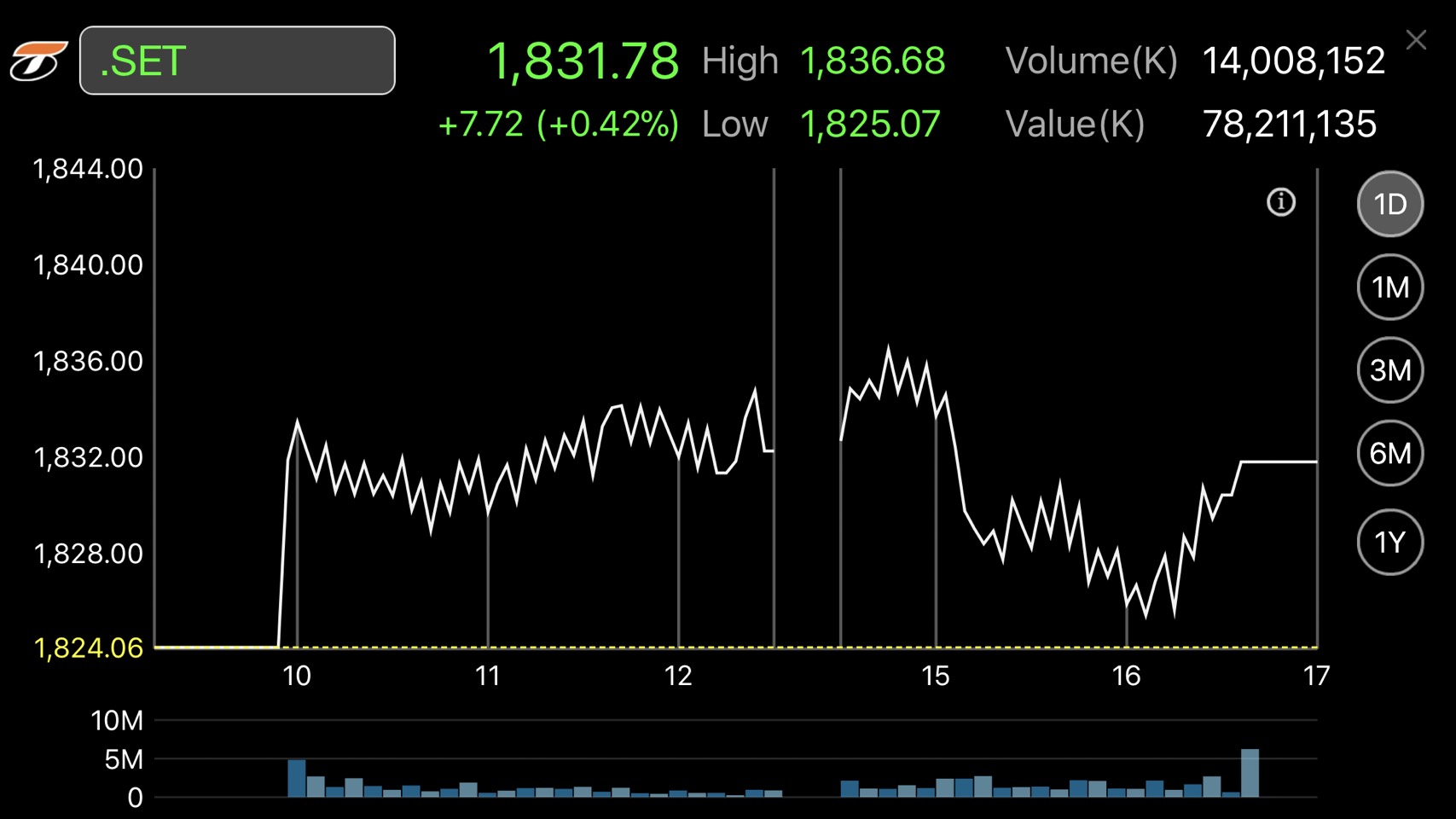 ผู้สื่อข่าวรายงานว่าดัชนีตลาดหลักทรัพย์ฯ ปิดที่ระดับ 1,831.78 จุด เพิ่มขึ้น 7.72 จุด (+0.42%) มูลค่าการซื้อขาย 78,211.14 ล้านบาท การซื้อขายหุ้นวันนี้ (23 ม.ค.) ดัชนีหุ้นเคลื่อนไหวแดนบวกตลอดทั้งวัน โดยดัชนีฯแตะจุดสูงสุดที่ 1,836.68 จุด และต่ำสุดที่ระดับ 1,825.07 จุด
