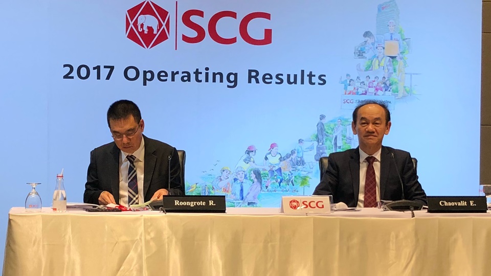 นายรุ่งโรจน์ รังสิโยภาส กรรมการผู้จักการใหญ่ เอสซีจี เปิดเผยว่า ผลการดำเนินงานปี 2560 น่าพอใจ แม้จะมีปัจจัยเรื่องสภาพการแข่งขันที่รุนแรงทั้งในไทยและภูมิภาค ต้นทุนวัตถุดิบสูงขึ้น และเงินบาทแข็งค่าเข้ามากระทบ ซึ่งเงินบาทแข็งค่าขึ้นทุก 1 บาทต่อดอลลาร์สหรัฐ ทำให้กำไรลดลง 2,000 ล้านบาท อย่างไรก็ตาม ราคาสินค้าเคมีภัณฑ์ที่ปรับตัวสูงขึ้น รวมถึงการเร่งตัวให้พร้อมรับมือกับความเปลี่ยนแปลงต่าง ๆ และการขยายสู่ธุรกิจบริการและโซลูชั่น บริษัทจึงมีกำไรลดลงร้อยละ 2 เมื่อเทียบกับปี 2559 โดยงบการเงินรวมก่อนตรวจสอบ ประจำปี 2560 มีรายได้จากการขาย 450,921 ล้านบาท เพิ่มขึ้นร้อยละ 6 จากปีก่อน จากราคาสินค้าเคมีภัณฑ์ที่ปรับตัวเพิ่มขึ้นมีกำไร 55,041 ล้านบาท แต่ลดลงร้อยละ 2 จากปีก่อน จากสภาพการแข่งขันที่รุนแรงในธุรกิจซิเมนต์และผลิตภัณฑ์ก่อสร้าง