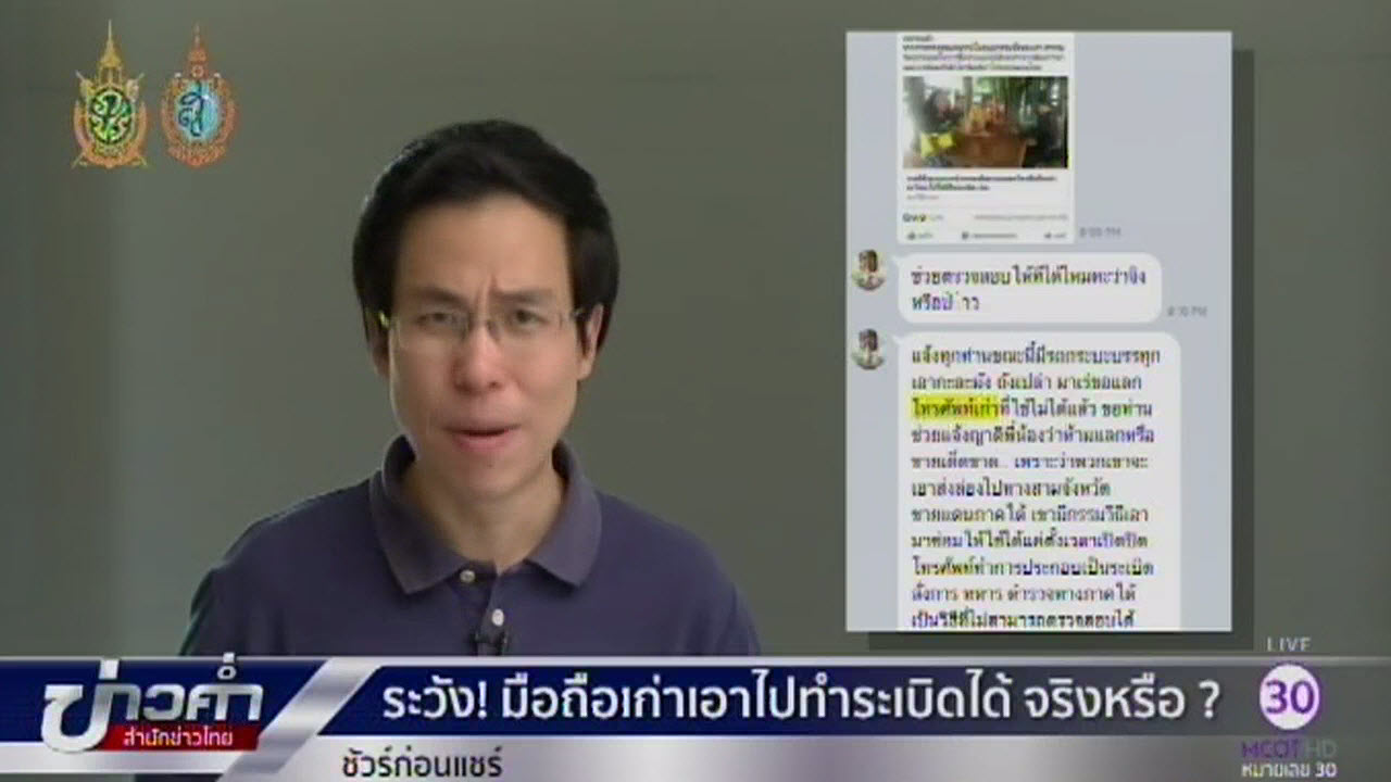 สำนักข่าวไทย 8 ต.ค.-บนสังคมออนไลน์มีการแชร์คลิป เตือนให้ระวังการขายมือถือเก่า อาจถูกนำไปประกอบระเบิดได้ เรื่องนี้จริงหรือไม่ ติดตามจากศูนย์ชัวร์ก่อนแชร์.-สำนักข่าวไทย