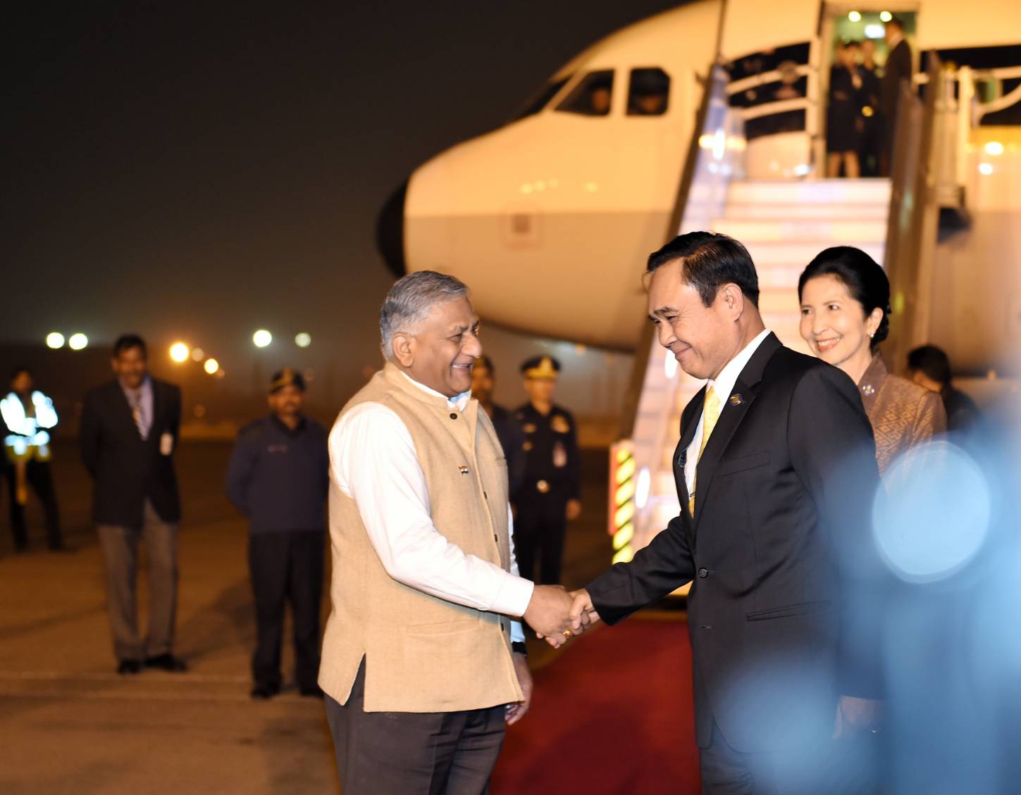 พล.อ.ประยุทธ์ จันทร์โอชา นายกรัฐมนตรี พร้อมด้วยนางนราพร จันทร์โอชา ภริยา และคณะ เดินทางถึงท่าอากาศยานกองทัพอากาศ ปาลาม (Palam Air Force Station) กรุงนิวเดลี สาธารณรัฐอินเดีย เมื่อเวลา 19.00 น.ตามเวลาท้องถิ่น ซึ่งช้ากว่าประเทศไทย 1 ชั่วโมง 30 นาที โดยนายกรัฐมนตรีมีกำหนดการเยือนสาธารณรัฐอินเดียระหว่างวันที่ 24-26 มกราคมนี้ เพื่อเข้าร่วมการประชุมสุดยอดอาเซียน-อินเดีย ในโอกาสครบรอบ 25 ปี ความสัมพันธ์อาเซียน-อินเดีย และร่วมเป็นแขกเกียรติยศกับผู้นำอาเซียนอีก 9 ประเทศ ในงานวันสถาปนาสาธารณรัฐอินเดียครั้งที่ 69 ในวันที่ 26 มกราคม