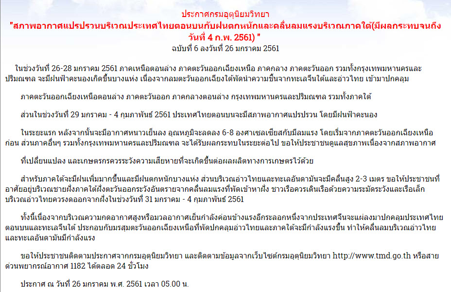 ส่วนในช่วงวันที่ 29 มกราคม – 4 กุมภาพันธ์ 2561 ประเทศไทยตอนบนจะมีสภาพอากาศแปรปรวน โดยมีฝนฟ้าคะนองในระยะแรก หลังจากนั้นจะมีอากาศหนาวเย็นลง อุณหภูมิลดลง 6-8 องศาเซลเซียส กับมีลมแรง โดยเริ่มจากภาคตะวันออกเฉียงเหนือก่อน ส่วนภาคอื่นๆ รวมทั้งกรุงเทพมหานครและปริมณฑล จะได้รับผลกระทบในระยะต่อไป ขอให้ประชาชนดูแลสุขภาพเนื่องจากสภาพอากาศที่เปลี่ยนแปลง และเกษตรกรควรระวังความเสียหายที่จะเกิดขึ้นต่อผลผลิตทางการเกษตรไว้ด้วย