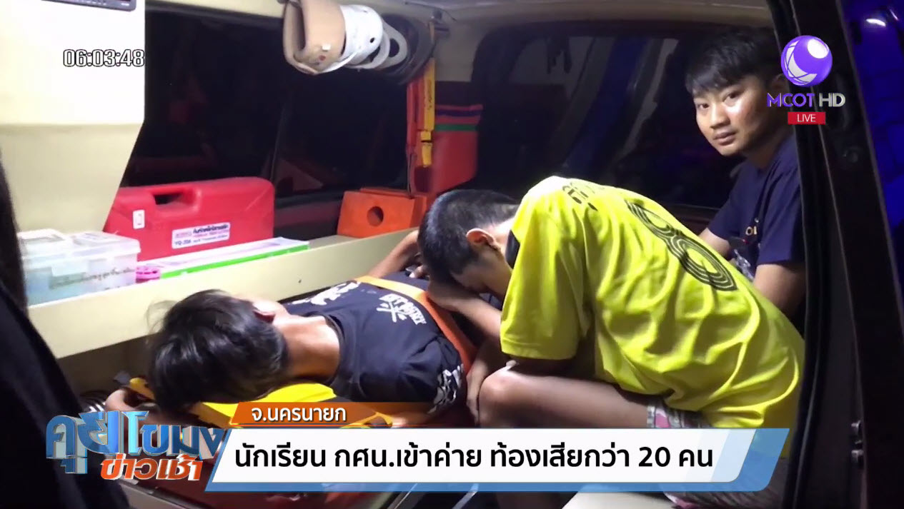 นครนายก 26 ม.ค. – นักเรียน กศน.อ่างทอง เข้าค่ายที่รีสอร์ทแห่งหนึ่งในตำบลสาลิกา อำเภอเมืองนครนายก เกิดอาการปวดท้อง คลื่นไส้ อาเจียน อาสากู้ภัยนำส่ง รพ. กว่า 20 คน
