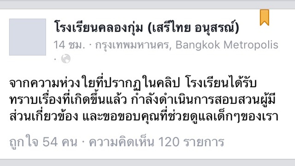 ด้านนายแพทย์พิชญา นาควัชระ รองปลัด กรุงเทพมหานคร เปิดเผยกับทีมข่าว ว่า เหตุการณ์ดังกล่าวเกิดขึ้นที่ โรงเรียนคลองกุ่ม เขตบึงกุ่ม สังกัด กทม. โดยสั่งการให้ผู้บังคับบัญชาตรวจสอบข้อเท็จจริงแล้ว เบื้องต้นทางโรงเรียนได้เชิญครู และผู้ปกครองของเด็กพิเศษ ชั้นป.5 มาพูดคุยถึงสาเหตุที่เกิดขึ้น และครูได้กล่าวขอโทษผู้ปกครองเรียบร้อยแล้ว ซึ่งทางผู้ปกครองไม่ติดใจเอาความแต่อย่างใด ส่วนการเอาผิดทางวินัยนั้น ผู้บังคับบัญชา ได้ว่ากล่าวตักเตือนแล้ว และกำชับต้องไม่เกิดเหตุการณ์แบบนี้ขึ้นอีก จากการสอบประวัติครูคนดังกล่าวไม่เคยมีพฤติกรรม ที่ไม่เหมาะสมมาก่อน