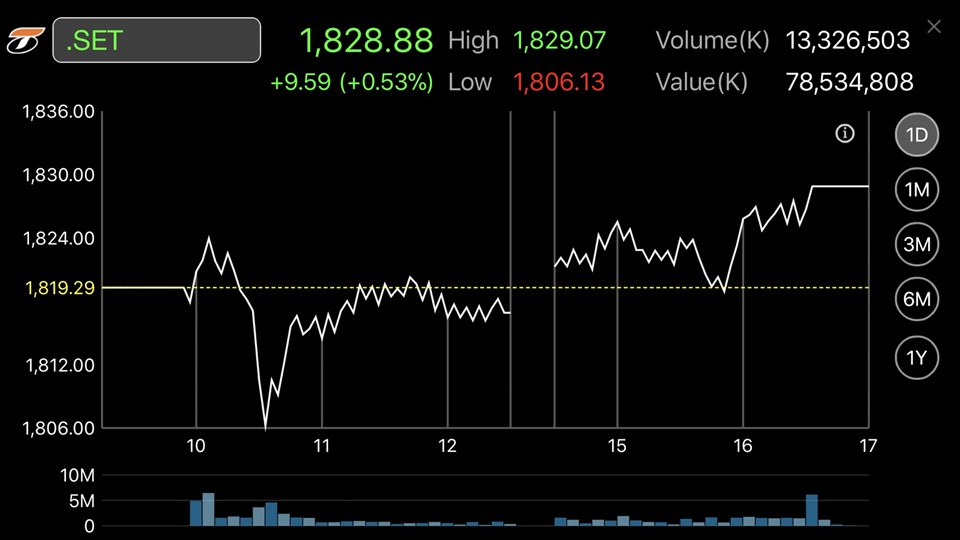 ปิดวันนี้ที่ระดับ 1,828.88 จุด เพิ่มขึ้น 9.59 จุด (+0.53%) มูลค่าการซื้อขาย