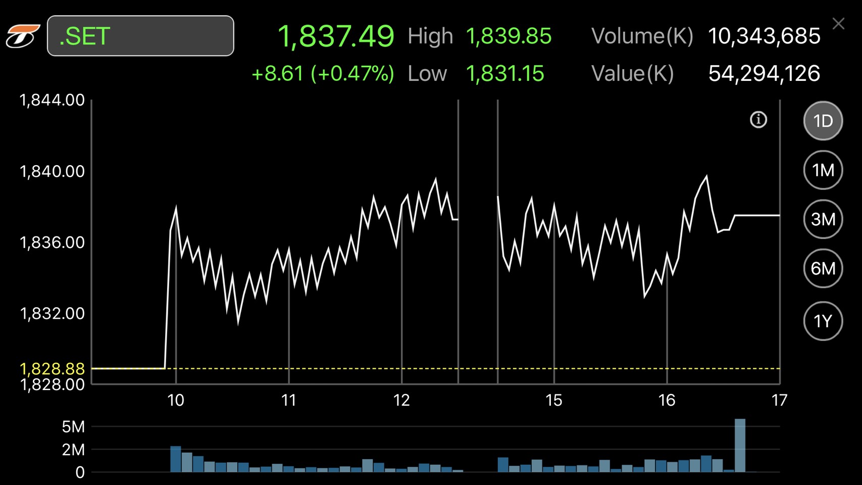 ผู้สื่อข่าวรายงานว่าดัชนีตลาดหลักทรัพย์ฯ ปิดที่ระดับ 1,837.49 จุด เพิ่มขึ้น 8.61 จุด มูลค่าการซื้อขาย 54,294.13 ล้านบาท การซื้อขายหุ้นวันนี้ ดัชนีหุ้นไทยเคลื่อนไหวในแดนบวกตลอดทั้งวัน โดยดัชนีฯแตะจุดสูงสุดที่ 1,839.85 จุด และแตะจุดต่ำสุดที่ระดับ 1,831.15 จุด