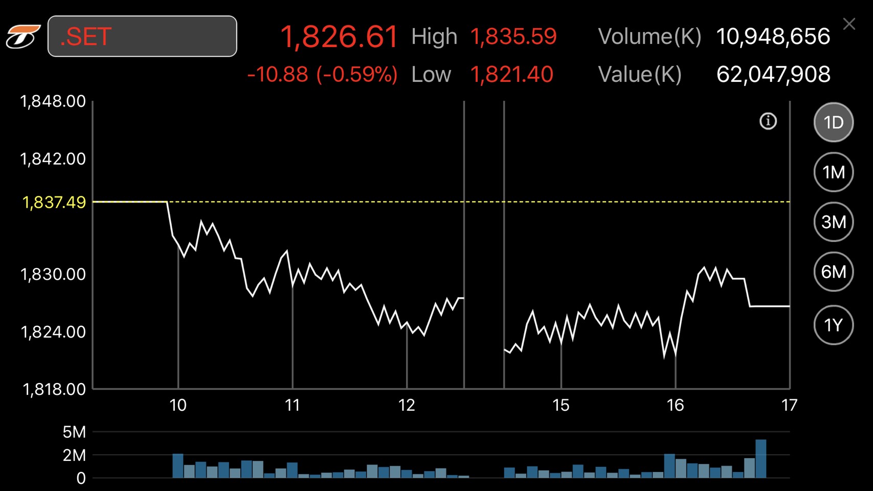 ผู้สื่อข่าวรายงานว่าดัชนีตลาดหลักทรัพย์ฯ ปิดที่ระดับ 1,826.61 จุด ลดลง 10.88 จุด (-0.59%) มูลค่าการซื้อขาย 62,047.91 ล้านบาท การซื้อขายหุ้นวันนี้ (30 ม.ค.) ดัชนีหุ้นไทยเคลื่อนไหวแดนลบตลอดทั้งวัน โดยดัชนีฯ แตะจุดสูงสุดที่ 1,835.59 จุด และต่ำสุดที่ระดับ 1,821.40 จุด