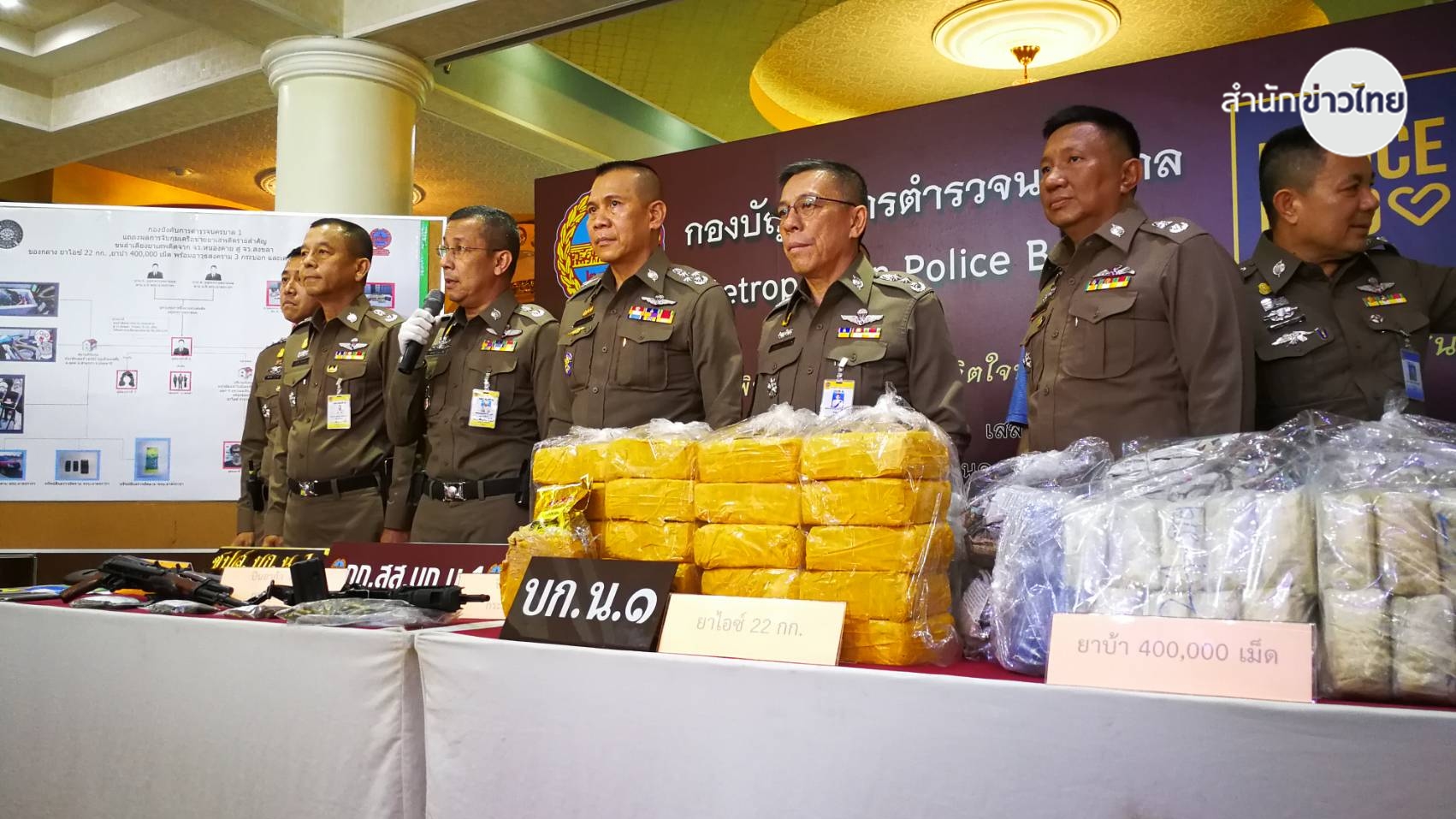 พล.ต.อ.เฉลิมเกียรติ ศรีวรขาน รอง ผบ.ตร. แถลงจับกุมผู้ต้องหา 7 คน พร้อมไอซ์ 22 กิโลกรัม ยาบ้า 400,000 เม็ด อาวุธปืนสงคราม AK 47, M16 และคาร์บิน รวม 3 กระบอก อยู่ในสภาพพร้อมใช้งาน พร้อมกระสุนปืน 307 นัด รถยนต์ 1 คัน ที่ห้องเช่าย่านสายไหม กรุงเทพฯ และปทุมธานี หลังชุดสืบสวนกองบังคับการตำรวจนครบาล 1 สืบทราบว่ากลุ่มผู้ต้องหาลักลอบจำหน่ายยาเสพติดในพื้นที่สายไหม จึงวางแผนจับกุม