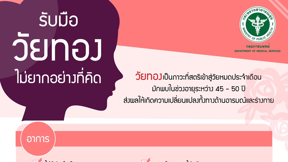 นพ.ณรงค์ อภิกุลวณิช รองอธิบดีกรมการแพทย์ กล่าวว่า วัยทองเป็นภาวะที่สตรีเข้าสู่วัยหมดประจำเดือน มักพบในช่วงอายุระหว่าง 45–50 ปี ส่งผลให้เกิดความเปลี่ยนแปลงทั้งทางด้านอารมณ์และร่างกาย โดยเมื่อเข้าสู่วัยทอง ร่างกายจะมีการเปลี่ยนแปลงเสมือนเป็นสัญญาณแจ้งเตือนล่วงหน้า คือประจำเดือนเริ่มมาคลาดเคลื่อน หรือมากะปริบกะปรอยและอาจหายขาดไปกว่า 1 ปี ก่อนจะหมดอย่างถาวร ซึ่งหลังจากที่ผู้หญิงเข้าสู่วัยทองหรือวัยหมดประจำเดือนแล้วจะเริ่มมีอาการต่าง ๆ ที่เกิดจากการเปลี่ยนแปลงของร่างกาย เช่น ไม่มีประจำเดือน ร้อนวูบวาบ ไม่สบายตัว มีเหงื่อออกในตอนกลางคืน มีปัญหาเรื่องการนอน นอนน้อย นอนไม่หลับ ผิวแห้ง หนังศีรษะบาง ผมร่วง อ้วนขึ้น ระบบเผาผลาญในร่างกายทำงานได้น้อยลง ไม่มีสมาธิ อารมณ์แปรปรวน และหงุดหงิดง่าย โดยสาเหตุเกิดจากรังไข่ไม่มีการตกไข่ ทำให้ไม่มีการผลิตฮอร์โมนเพศอย่างเอสโตรเจนและโปรเจสเตอโรนอีกต่อไป