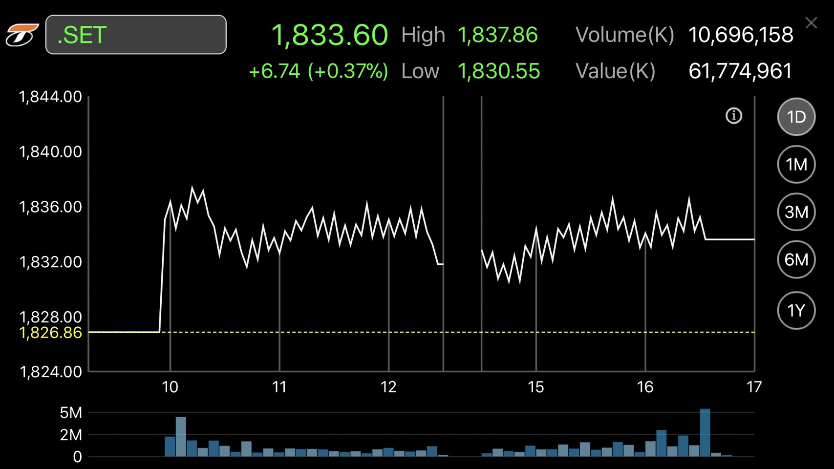 ผู้สื่อข่าวรายงานว่าดัชนีตลาดหลักทรัพย์แห่งประเทศไทย (ตลท.) ปิดการซื้อขายที่ระดับ 1,833.60 จุด เพิ่มขึ้น 6.74 จุด หรือ ร้อยละ 0.37 มูลค่าการซื้อขาย 61,774.96 ล้านบาท การซื้อขายหุ้นไทยวันนี้ (1 ก.พ.) ดัชนีเคลื่อนไหวแดนบวกตลอดทั้งวันปรับตัวขึ้นสูงสุดที่ระดับ 1,837.86 จุด และต่ำสุดที่ระดับ 1,830.55 จุด โดยมีแรงซื้อเข้ามาในหุ้นกลุ่มพลังงาน เนื่องจากราคาน้ำมันปรับสูงขึ้น และมีการเก็งกำไรในหุ้นรายตัวที่มีการประกาศผลการดำเนินงานของบริษัทจดทะเบียน