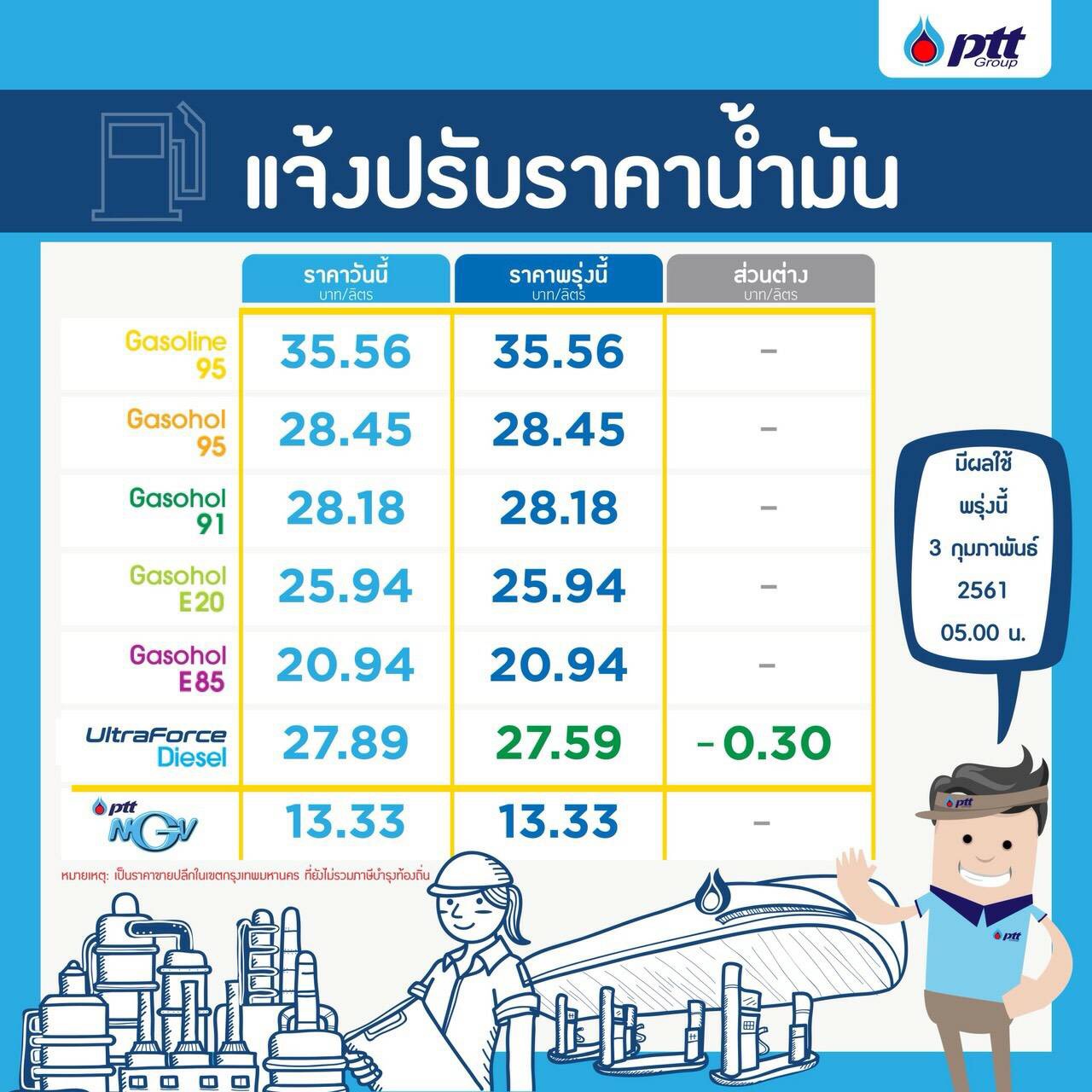 บมจ.ปตท.และ บมจ.บางจาก คอร์ปอเรชั่น ประกาศปรับราคาขายปลีกน้ำมันดีเซล ลดลง 30 สตางค์ต่อลิตร ส่วนกลุ่มเบนซินและแก๊สโซฮอล์คงเดิม มีผล 3 ก.พ. 2561 เวลา 05.00 น. เป็นต้นไป โดยราคาขายปลีกจะเป็นดังนี้ เบนซิน 95 อยู่ที่ 35.56 บาท แก๊สโซฮอล์ 95 อยู่ที่ 28.45 บาท E20 อยู่ที่ 25.94 บาท แก๊สโซฮอล์ 91 อยู่ที่ 28.18 บาท E85 อยู่ที่ 20.94 และดีเซล 27.59 บาทต่อลิตร โดยราคาขายปลีกข้างต้นยังไม่รวมภาษีบำรุงกรุงเทพมหานคร.-สำนักข่าวไทย