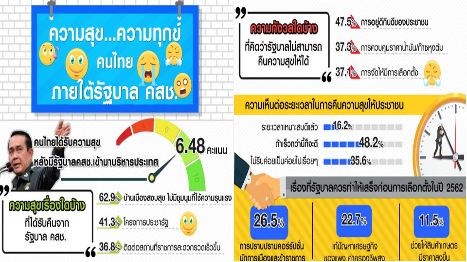 กรุงเทพโพลล์ โดยศูนย์วิจัยมหาวิทยาลัยกรุงเทพ สำรวจความคิดเห็นประชาชน เรื่อง “ความสุข…ความทุกข์คนไทยภายใต้รัฐบาล คสช.” เก็บข้อมูลกับประชาชนจากทุกภูมิภาคทั่วประเทศ จำนวน 1,212 คน พบว่า ระดับความสุขที่คนไทยได้รับหลังจากที่รัฐบาล คสช. เข้ามาบริหารประเทศ มีค่าเฉลี่ยอยู่ที่ 6.48 คะแนน จากเต็ม 10 คะแนน ถือว่ามีความสุขอยู่ในระดับปานกลาง