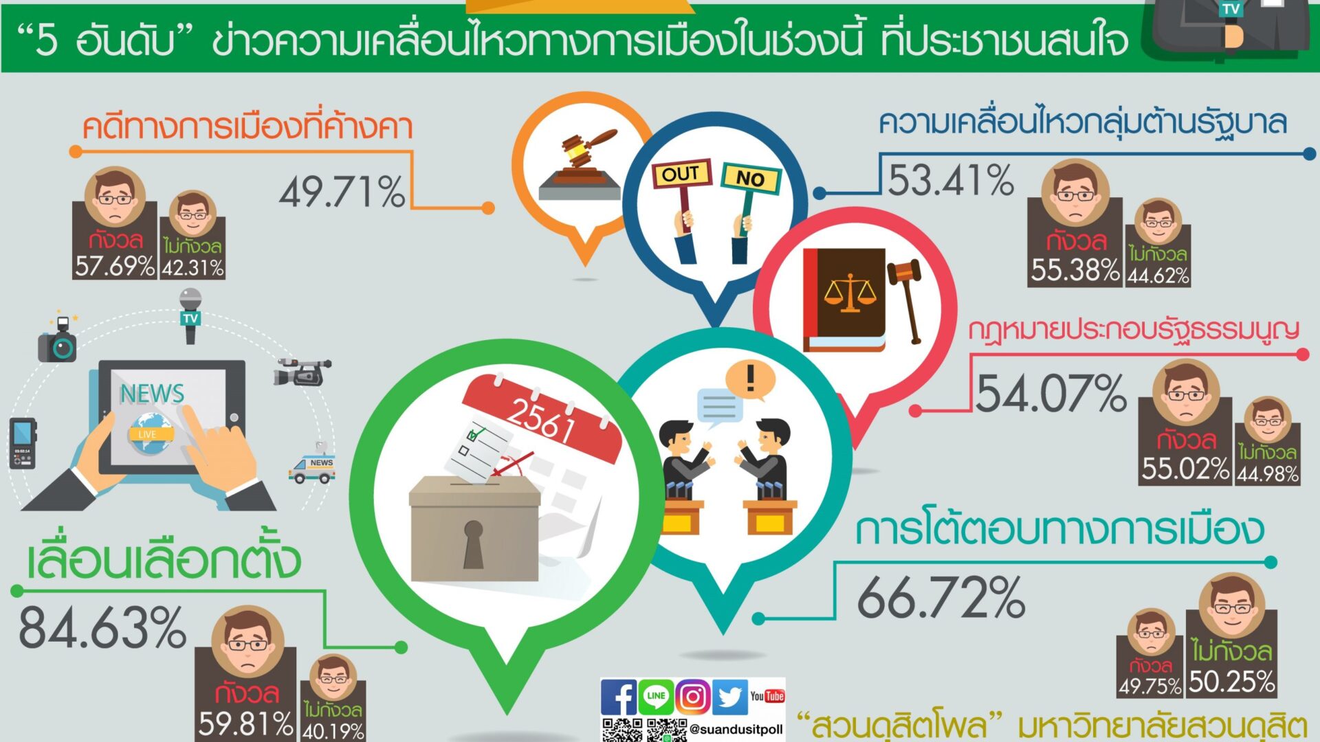 สวนดุสิตโพล โดยมหาวิทยาลัยสวนดุสิต สำรวจความคิดเห็นประชาชน เรื่อง ความสนใจของประชาชน ต่อ “ความเคลื่อนไหวทางการเมือง” โดยสำรวจความคิดเห็นของประชาชนทั่วประเทศ จำนวนทั้งสิ้น 1,217 คน ระหว่างวันที่ 30 มกราคม – 3 กุมภาพันธ์ 2561 พบว่า ข่าวความเคลื่อนไหวทางการเมืองในช่วงนี้ อันดับที่ 1 ประชาชนร้อยละ 84.63 สนใจเรื่องเลื่อนการเลือกตั้งมากที่สุด เพราะต้องการทราบกำหนดวันเลือกตั้ง เหตุผลที่แท้จริงในการเลื่อนการเลือกตั้งของรัฐบาล ซึ่งมีผลต่อการพัฒนาประเทศ เศรษฐกิจ และชีวิตความเป็นอยู่  อันดับที่ 2 ประชาชนร้อยละ 66.72 สนใจเรื่องการโต้ตอบทางการเมืองของรัฐบาลกับนักการเมืองและกลุ่มเคลื่อนไหว เพราะอยากรู้ข้อเท็จจริงในหลายประเด็น และเห็นแนวคิด เหตุผล ท่าทีของแต่ละฝ่ายที่ออกมาเคลื่อนไหว ตลอดจนการแก้ปัญหาของรัฐบาล อันดับที่ 3 ประชาชนร้อยละ 54.07 สนใจเรื่องกฎหมายประกอบรัฐธรรมนูญ เพราะเป็นกฎหมายสำคัญ แต่เป็นเรื่องที่เข้าใจยาก ควรมีความรู้ความเข้าใจ เนื่องจากมีผลต่อการเลือกตั้ง พรรคการเมือง และนักการเมือง อันดับที่ 4 ประชาชนร้อยละ 53.41 สนใจเรื่องความเคลื่อนไหวกลุ่มต้านรัฐบาล กลุ่มฟื้นฟูประชาธิปไตย เพราะต้องการทราบว่า การเคลื่อนไหวครั้งนี้จะบานปลายหรือไม่ จะมีใครหรือคนกลุ่มใดออกมาร่วมด้วยอีก ใครอยู่เบื้องหลัง และรัฐบาลจะดำเนินการอย่างไร และอันดับที่ 5 ประชาชนร้อยละ 49.71 สนใจเรื่องคดีทางการเมืองที่ค้างคา เพราะอยากให้ดำเนินคดีอย่างถูกต้อง เป็นธรรมกับทุกฝ่าย ผู้ที่ทำผิดจะได้รับการลงโทษอย่างไร และบางคดีเป็นคดีสำคัญที่หลายฝ่ายจับตามองรัฐบาล