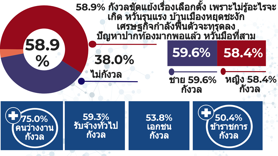 ทั้งนี้ เมื่อจำแนกความกังวลขัดแย้งเรื่องเลือกตั้งออกตามเพศ พบว่า ส่วนใหญ่ทั้งชายและหญิงกังวลไม่แตกต่างกัน คือ เพศชายร้อยละ 59.6 และเพศหญิง ร้อยละ 58.4 กังวลความขัดแย้งเรื่องเลือกตั้งเช่นกัน นอกจากนี้ เมื่อแบ่งตามช่วงอายุ พบว่า คนสูงอายุส่วนใหญ่ ร้อยละ 62.7 กังวลขัดแย้งเรื่องเลือกตั้งมากกว่าทุกกลุ่ม รองลงมา คือ กลุ่มคนวัยทำงานร้อยละ 59.0 และกลุ่มเยาวชนร้อยละ 58.4 ในขณะที่กลุ่มเยาวชนร้อยละ 39.7 ไม่กังวลมากกว่ากลุ่มอื่น