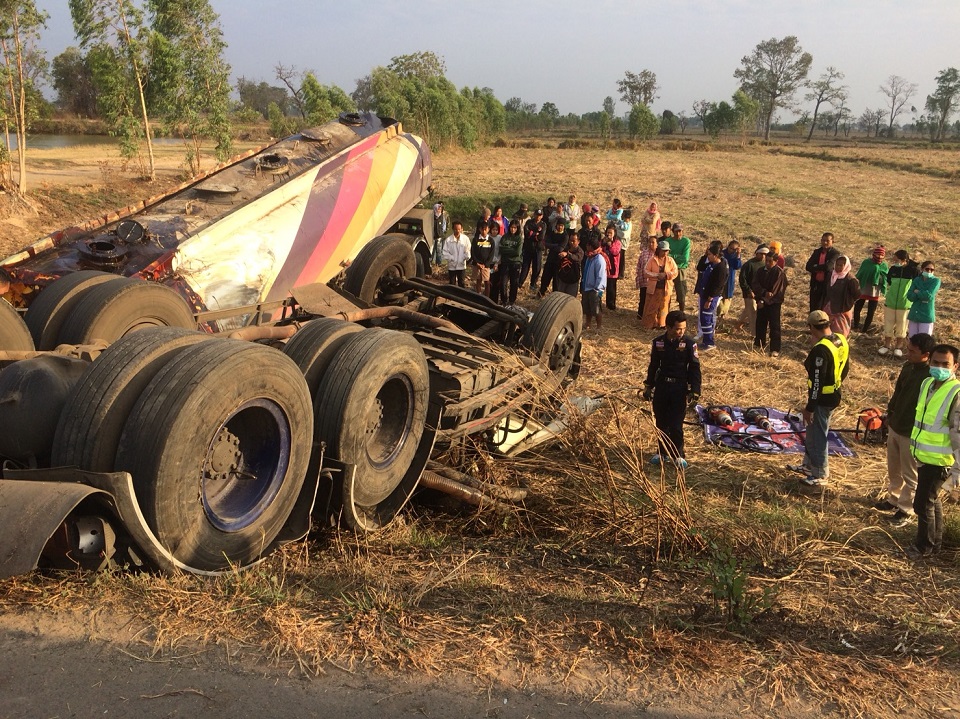 บุรีรัมย์ 4 ก.พ.- กู้ภัยเร่งนำร่างคนขับเสียชีวิตออกจากซากรถพ่วงบรรทุกกากน้ำตาล หลังเกิดอุบัติเหตุหงายท้องลงข้างถนนสายแคนดง