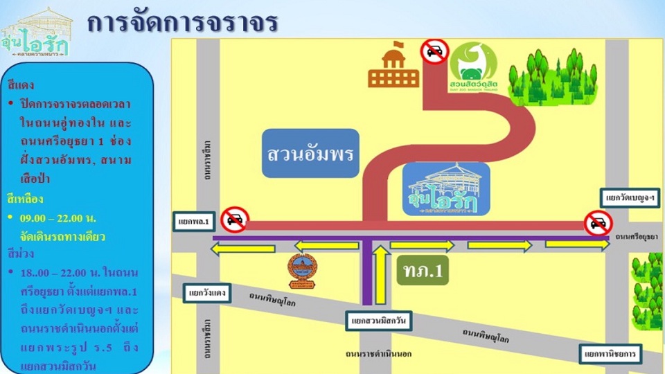 ปิดการจราจร (สีแดง) ในถนนอู่ทองใน และถนนศรีอยุธยา 1 ช่องฝั่งสวนอำพร,สนามเสือป่า ตั้งแต่แยกพล.1 ถึงแยกวัดเบญจฯ, จัดการจราจรเดินรถทางเดียว (สีเหลือง) ถนนราชดำเนินนอก ให้เลี้ยวซ้าย,ขวา ที่ถนนศรีอยุธยา จึงขอประชาสัมพันธ์ผู้ใช้รถใช้ถนนได้รับทราบ หากจำเป็นจะต้องใช้เส้นทางดังกล่าวควรเตรียมความพร้อมและวางแผนในการเดินทางหากต้องการสอบถามข้อมูลเส้นทางแจ้งอุบัติเหตุจราจร และข้อมูลสภาพจราจรเพิ่มเติมสามารถสอบถามได้ที่ศูนย์ควบคุมและสั่งการจราจร (บก.02) หมายเลข 1197 ตลอด 24 ชั่วโมง หรือ ผ่านแอพพลิเคชั่น POLICE I LERT U และ WWW.TRAFFICPOLICE.CO.TH.-สำนักข่าวไทย